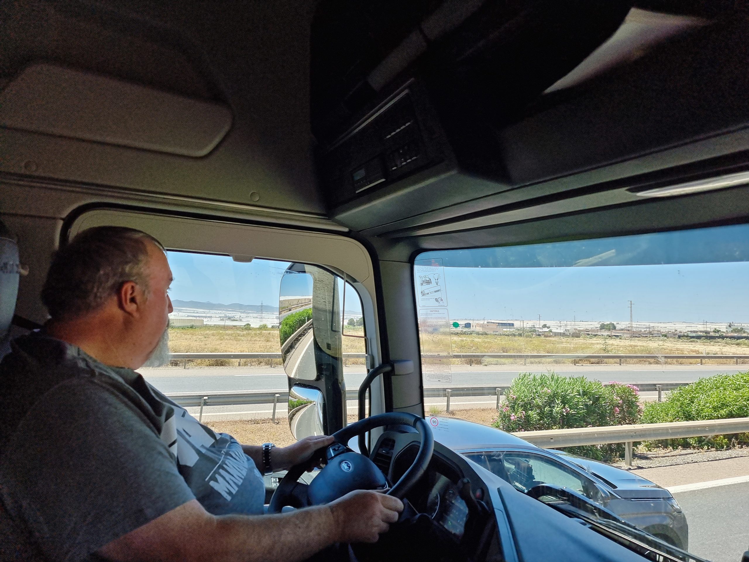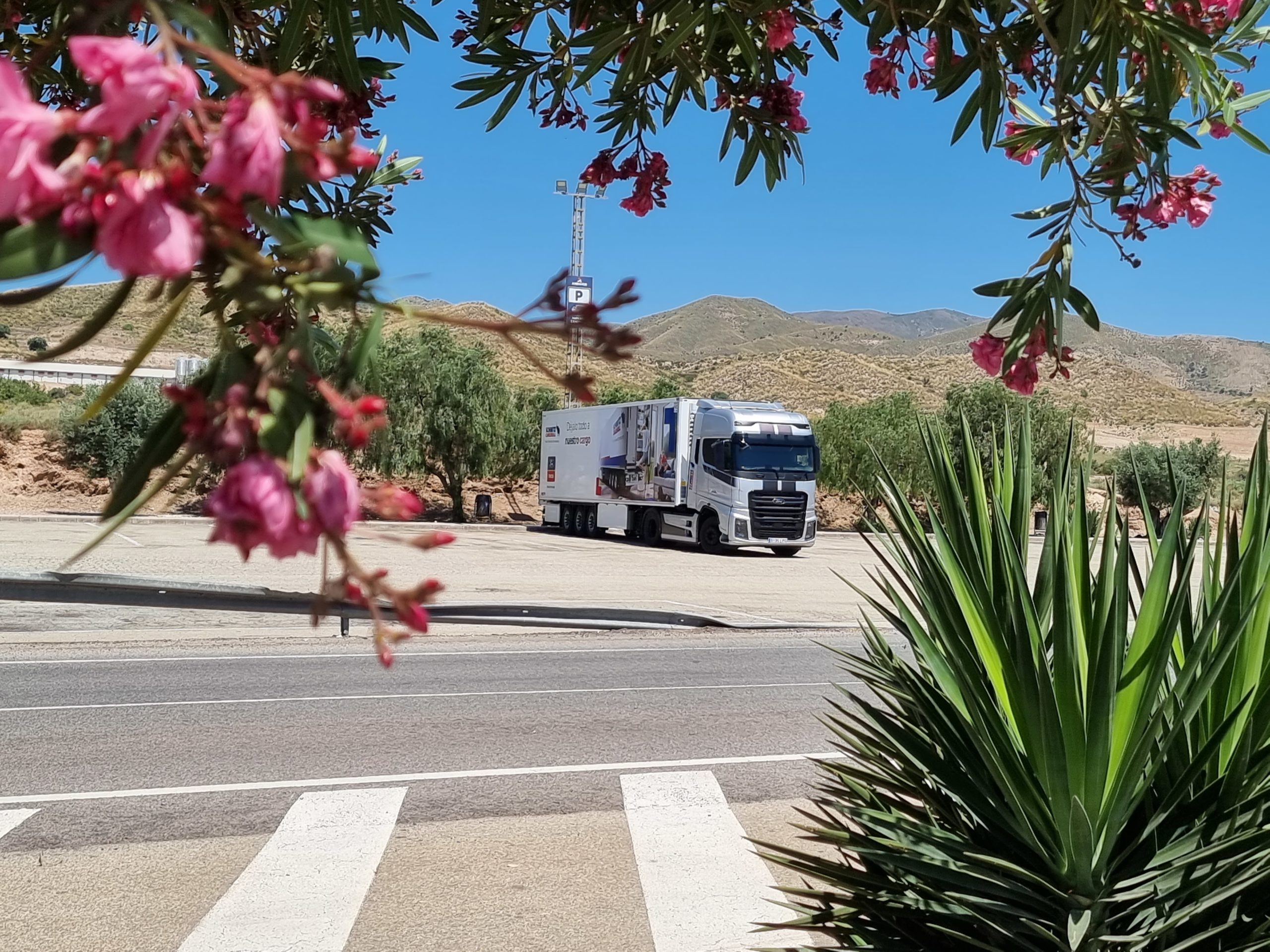 Al final completamos la ruta en la población almeriense de El Ejido. Allí quedó el frigo que nos acompañó en 10.000 kms de esta ruta. En concreto en manos de un transportista de Adra que nos recibía con una tractora que a estas alturas de la ruta ya nos resultaba muy familiar.