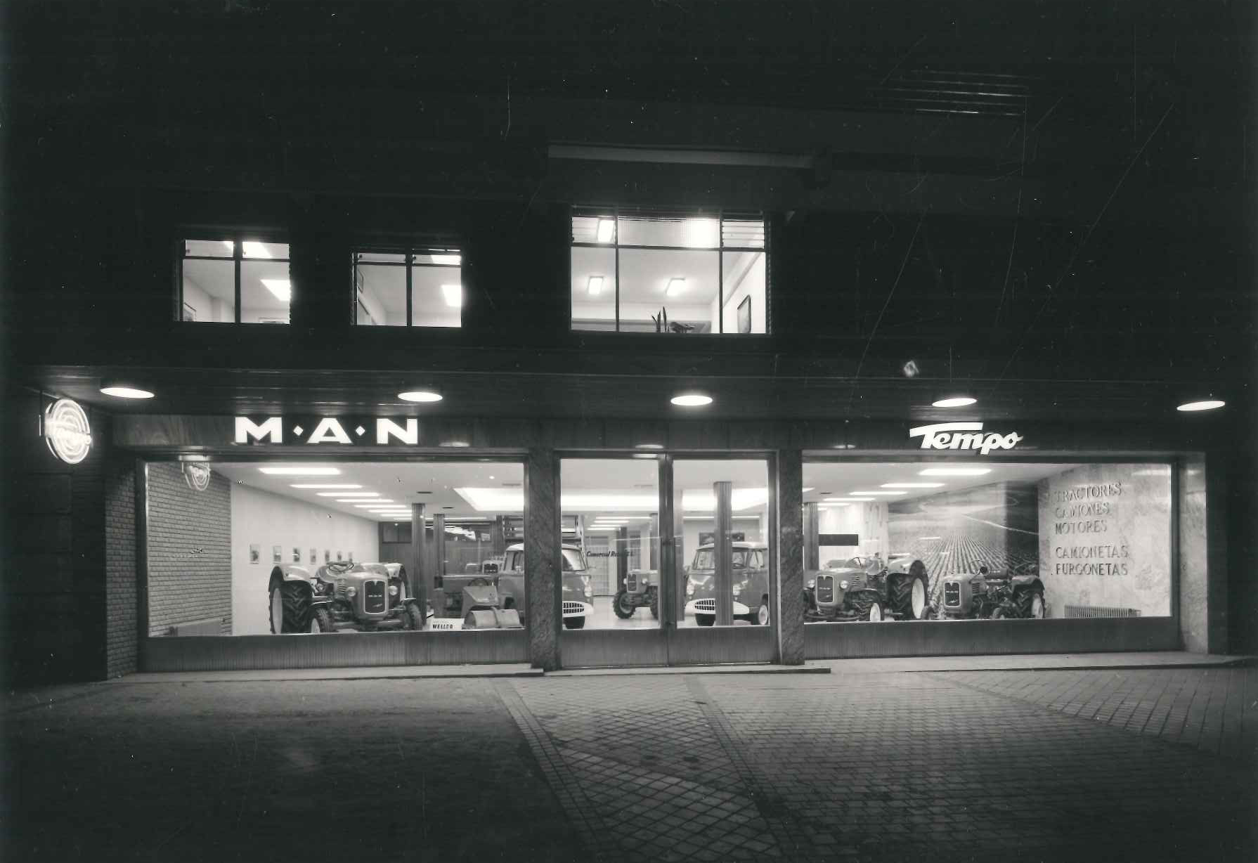 La primera sede de MAN en España estuvo en la madrileña calle Goya. El protagonismo de los camiones MAN se compartía con las furgonetas Tempo alemanas, además de los tractores agrícolas MAN y Fendt. 50 años de MAN Trucks & Bus en España