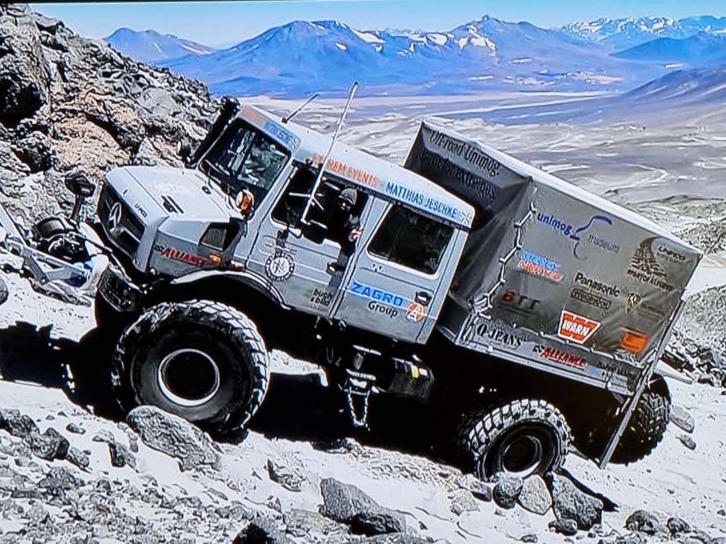 Aquí vemos el camión Unimog 4X4 que obtuvo el récord de mayor altitud sobre el nivel del mar en los Andes.