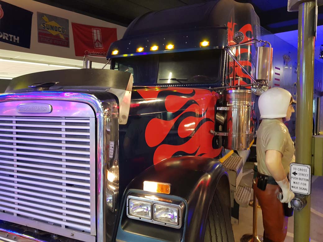 Eso sí en la barra de esta area de Fraga las placas de matrícula, los nombres de las marcas de camiones americanos e incluso un auténtico Freightliner nos trasladan a lo más espectacular de las rutas americanas del transporte.
