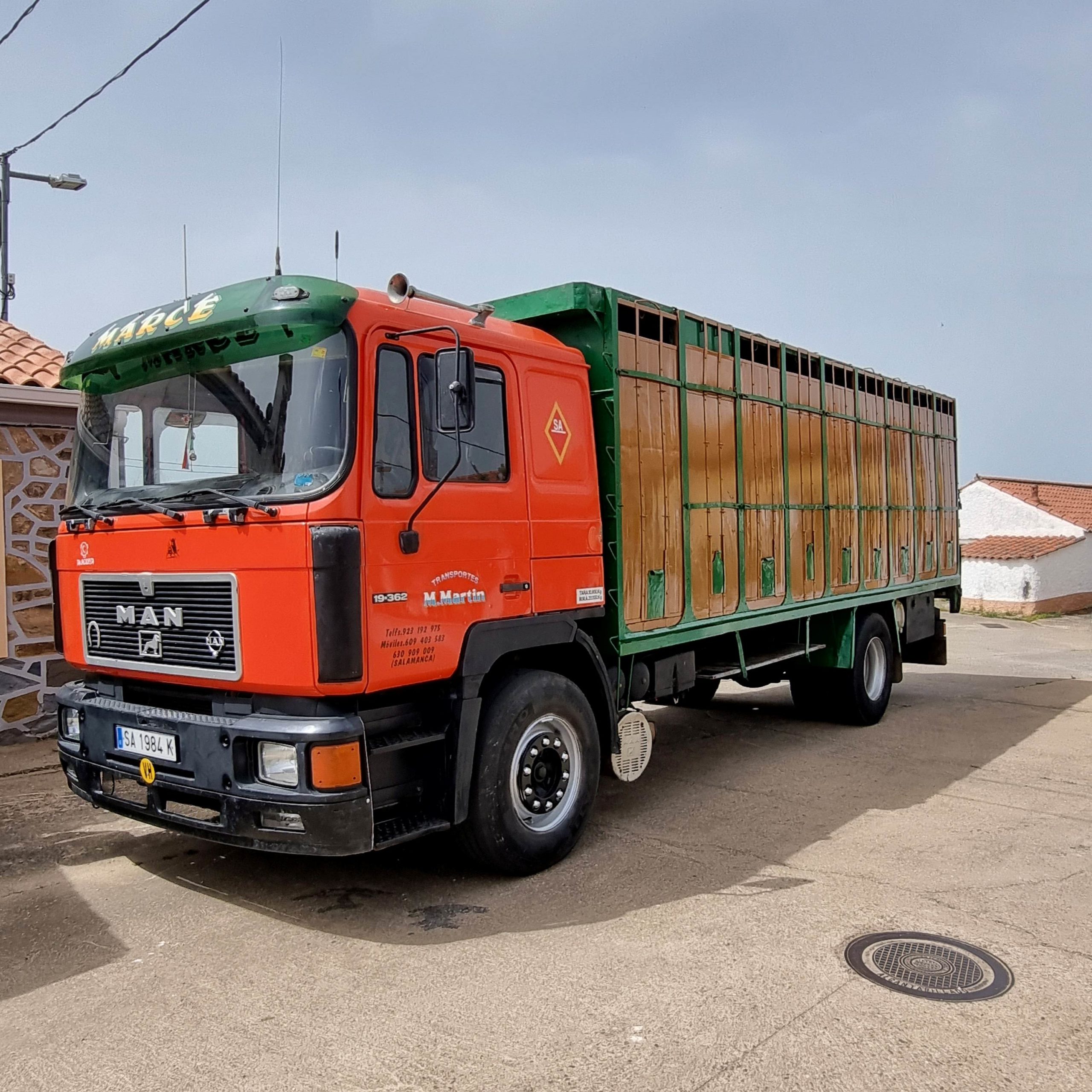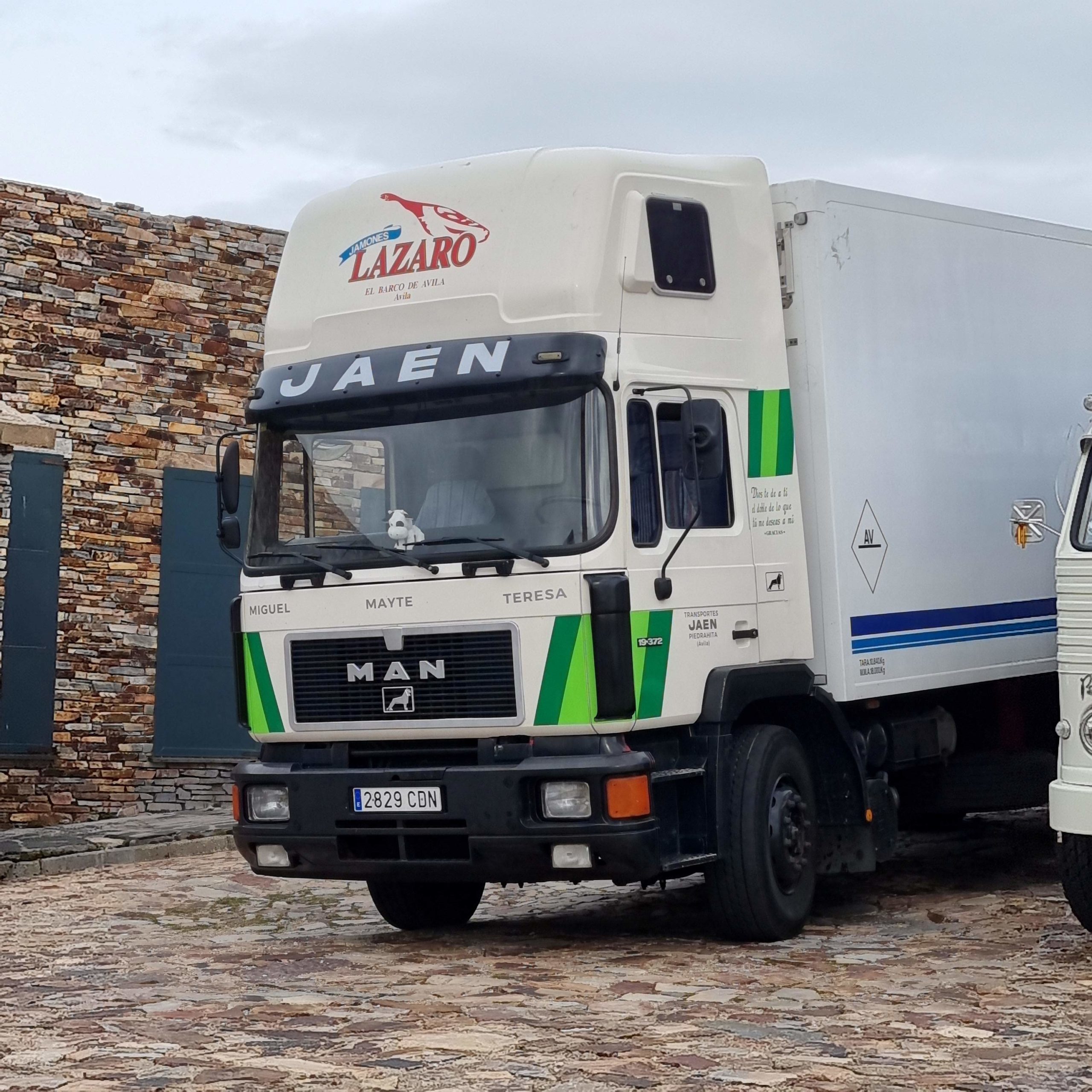 Uno de los camiones que más llamó la atención durante la jornada fue el magníficamente conservado MAN 19.360 dos ejes con jaula ganadera. No en vano este camión propio de los 90 del siglo pasado, se dedicó al transporte de toros de lidia. De hecho la esquina trasera de su cabina luce un abultamiento fruto de una coz de esos fieros animales.