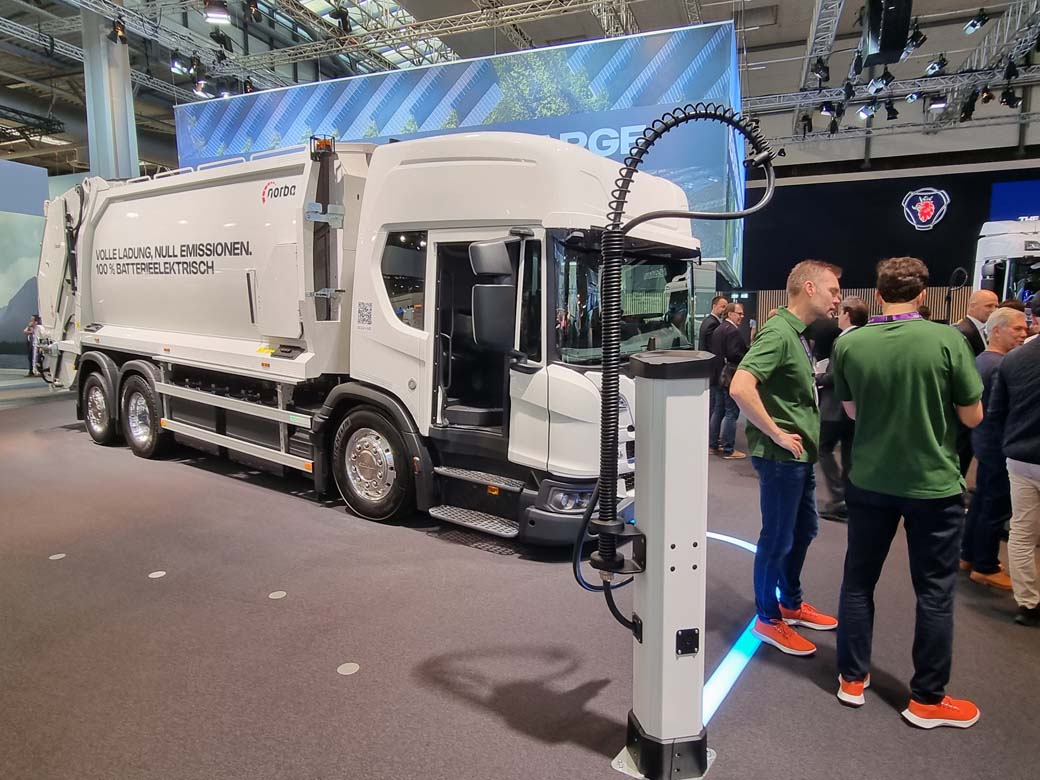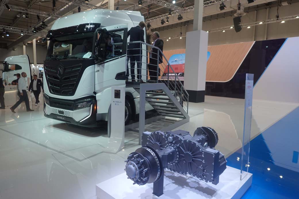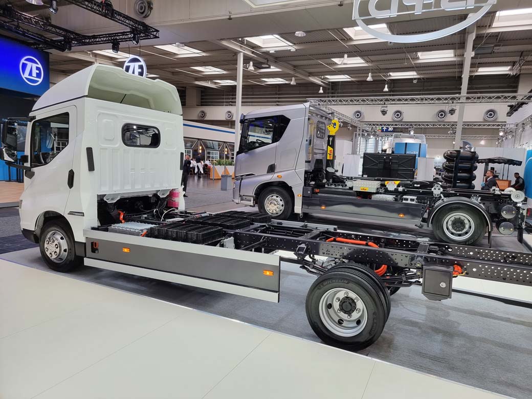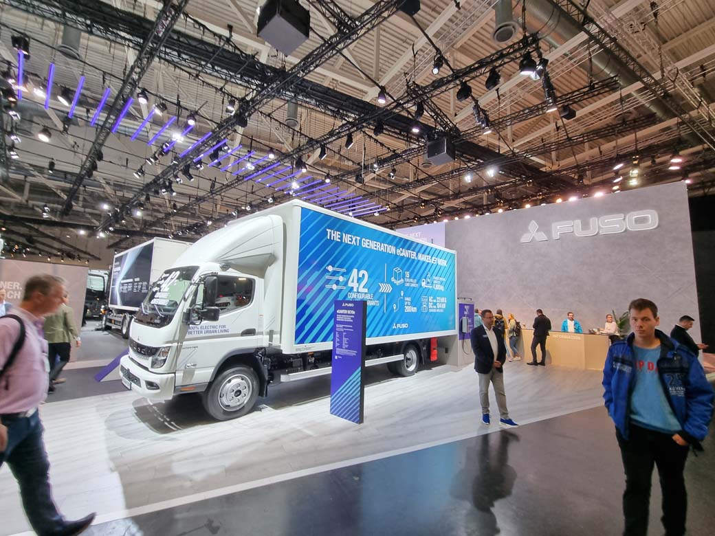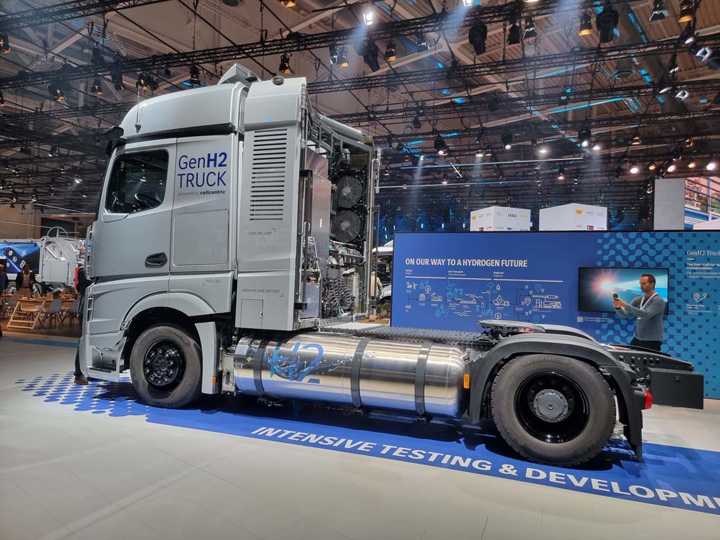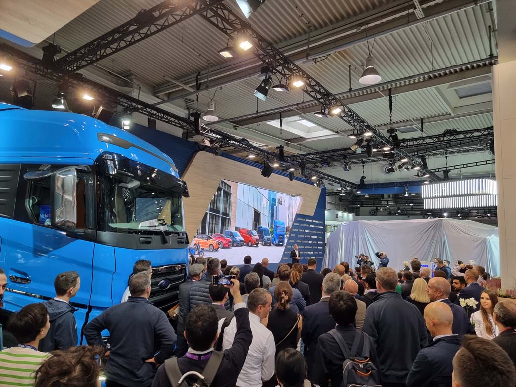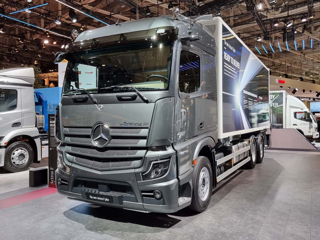 Mercedes Benz Trucks volvió a ofrecer la exposición más extensa de vehículos de todo el IAA, como es tradición. En esta ocasión estuvo muy focalizada en los camiones eléctricos. Mostró las mil y una caras tecnológicas de su conocido Actros. Si bien el diésel sigue centrando casi la totalidad de las ventas el eActros eléctrico a baterías. Se ofrece en serie en sus versiones 300 y 400 tanto en chasis rígidos de dos y tres ejes como en tractoras. Son camiones destinados a la distribución media y pesada. Según la aplicación, capacidad de baterías instalada y ruta pueden obtenerse con una sóla carga eléctrica entre 200 y 500 kilómetros de autonomía.