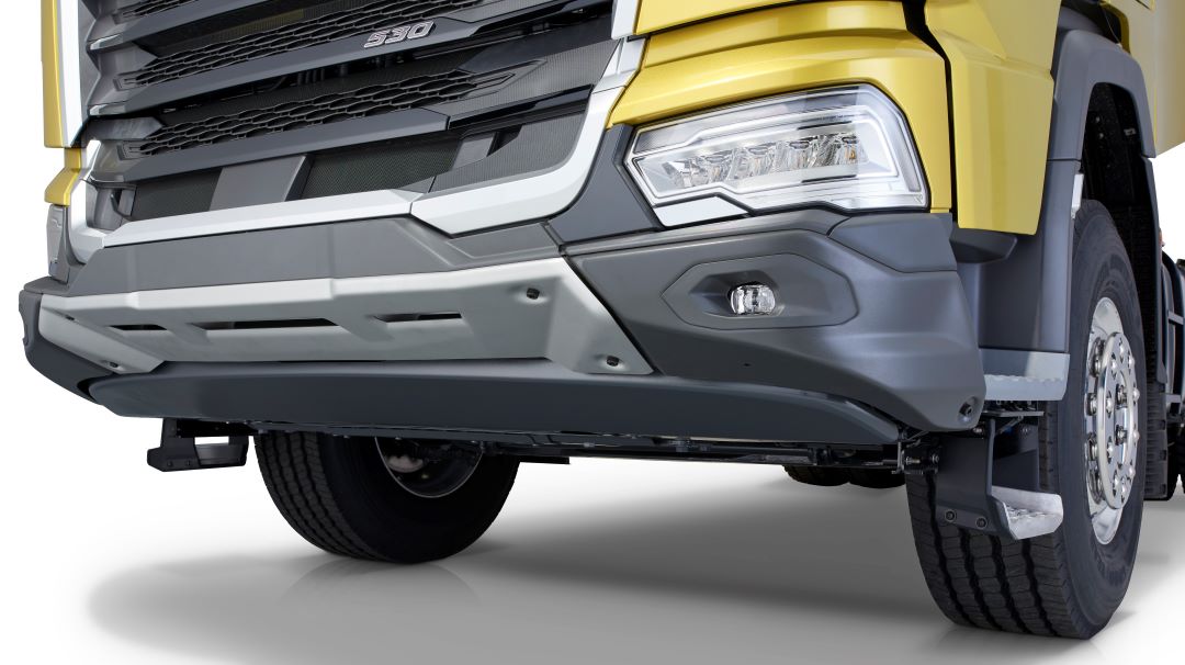 De los DAF XDc y XFc, destacan el gran ángulo de aproximación de 25° y una gran altura libre sobre el suelo de 33 a 39 cm, en función de la especificación. Los camiones de construcción DAF tienen un diseño robusto, con un resistente parachoques de acero de tres piezas, una parrilla con franjas negras y una placa de protección del radiador de acero de serie.
