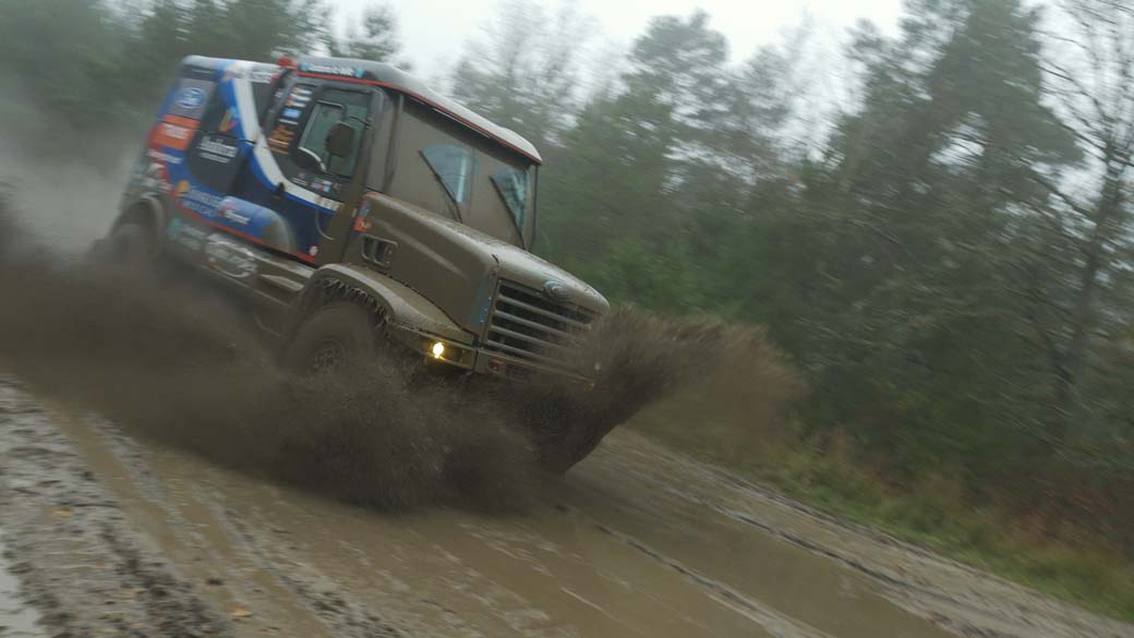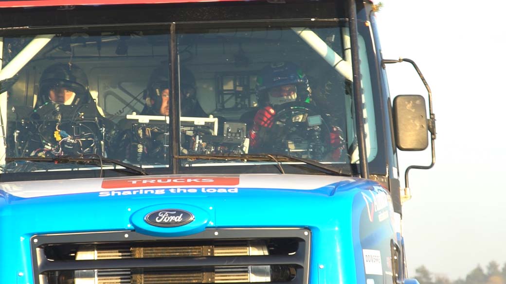 Cabina: Ford Trucks gama Legacy adaptada con arco de seguridad y backets para piloto y dos copilotos, mecánico y navegante. Mandos adaptados por Guidosimplex para operar completamente con las manos desde el volante y caja de cambios.