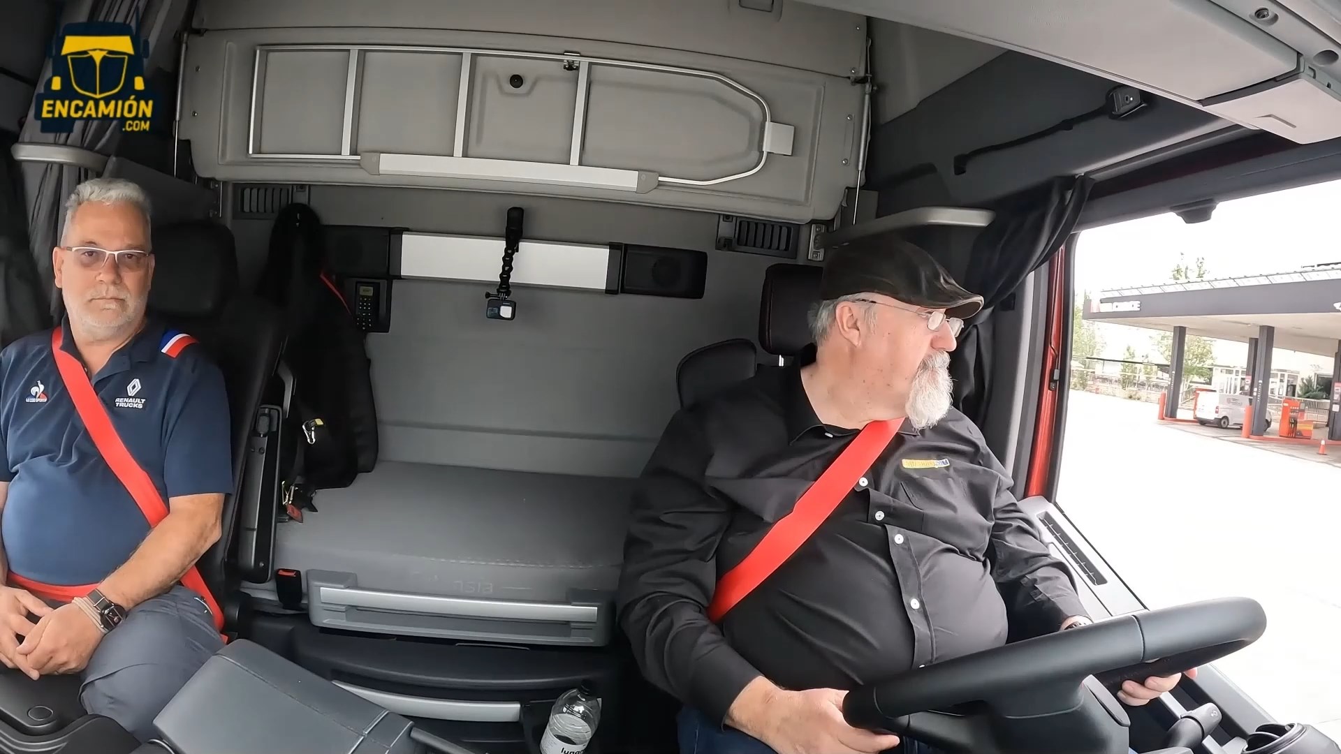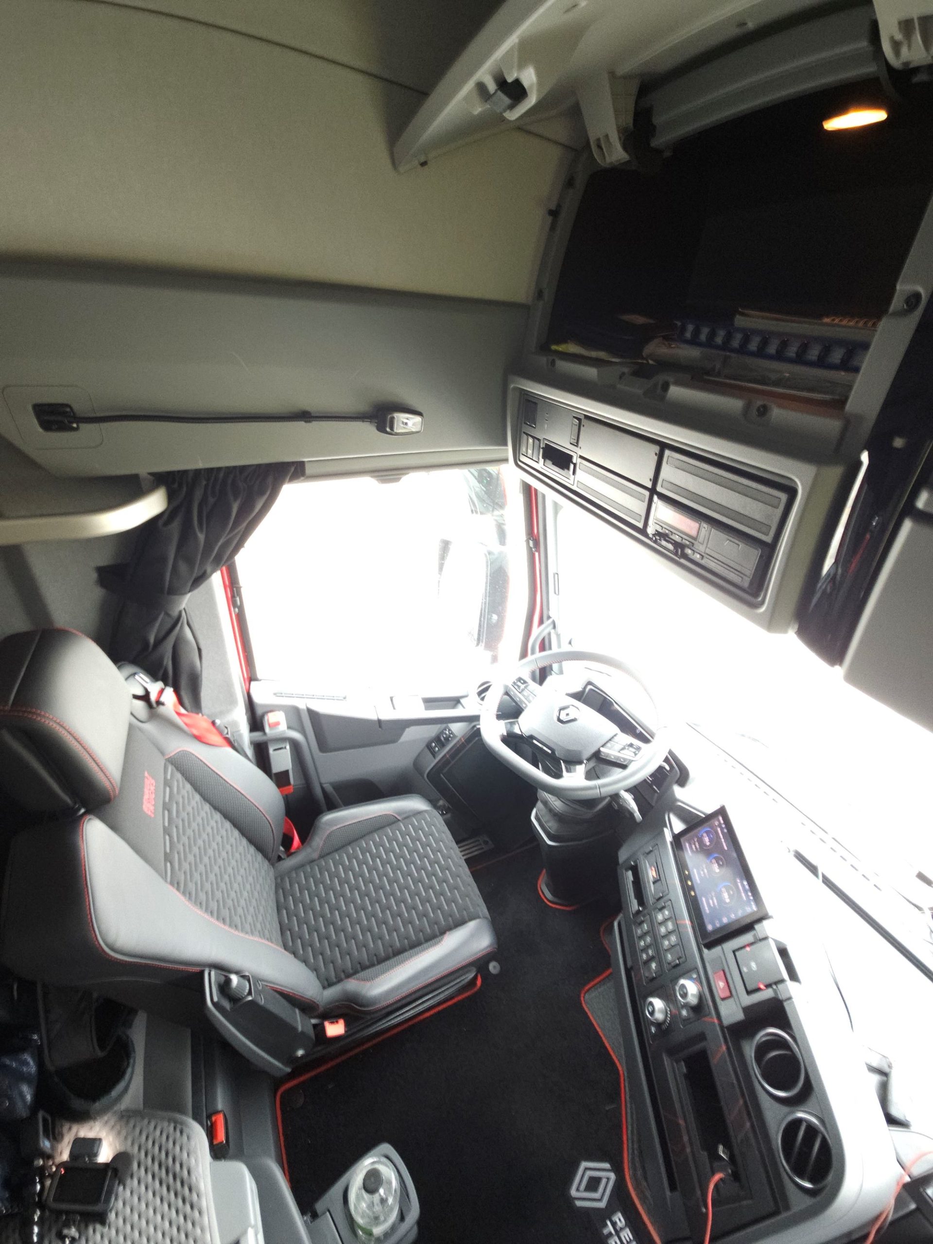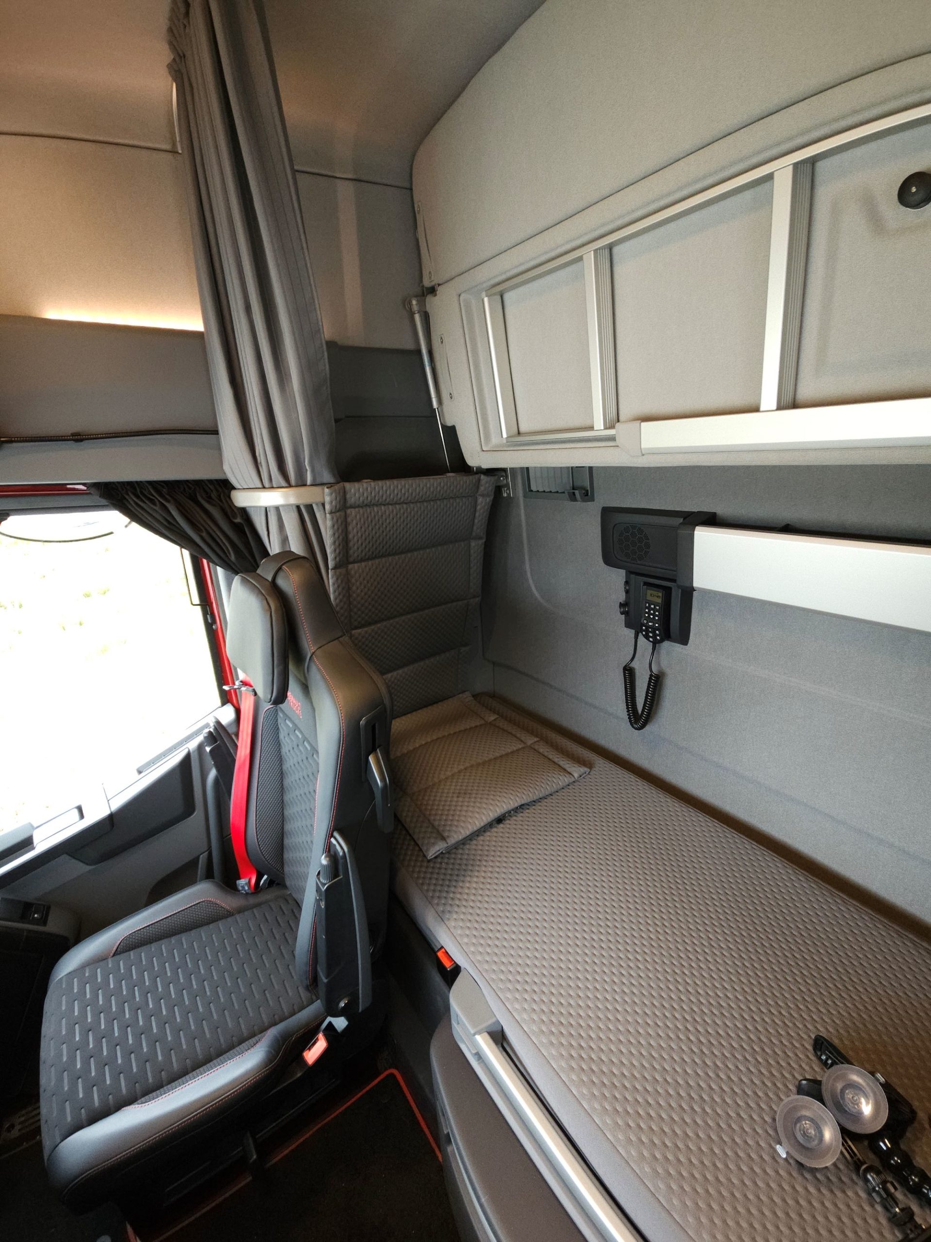 - La cabina, aquí probamos la versión High Sleeper Cab de piso completamente llano, es sin embargo muy confortable. Hemos notado menos ruidos aerodinámicos que en el pasado. El motor funciona tan bajo de vueltas que ayuda al silencio interior. Además elementos como la cama superior articulada para usar como armario, asiento del pasajero giratorio y mesa retráctil ofrecen un excelente confort durante los descansos.