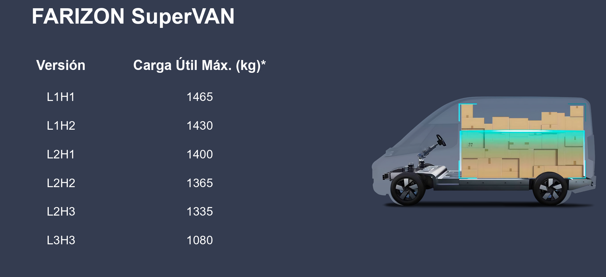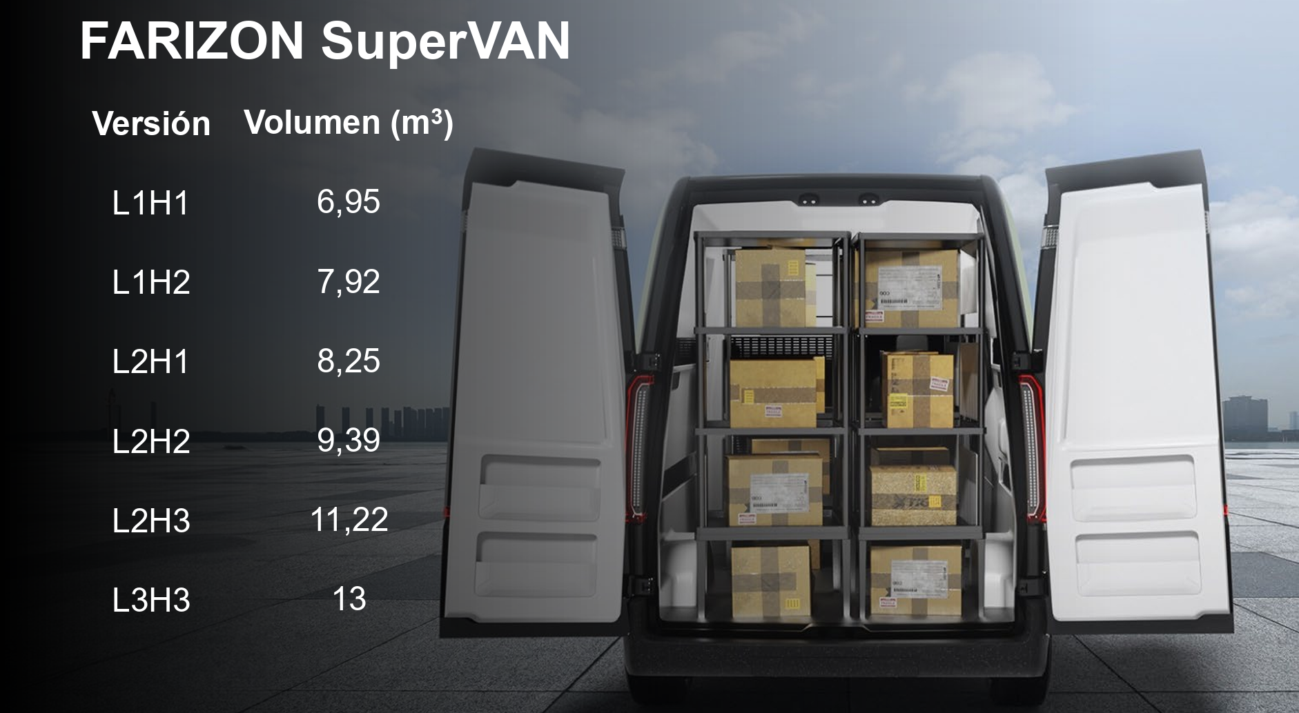 - Existen tres distancias entre ejes, dos alturas de carrocería y cuatro capacidades de baterías para equipar el Farizon Supervan. Por ello el volumen útil de la bodega de carga va desde los 6,95 m3 del modelo más compacto hasta los 13 m3 de volumen útil en el modelo de techo alto y mayor distancia entre ejes. La carga útil se mueve entre los 1.080 y los 1.465 kilogramos. Siempre en una furgoneta eléctrica cero emisiones de hasta 4.250 Kilogramos MMA que se puede conducir con la licencia B de turismo.