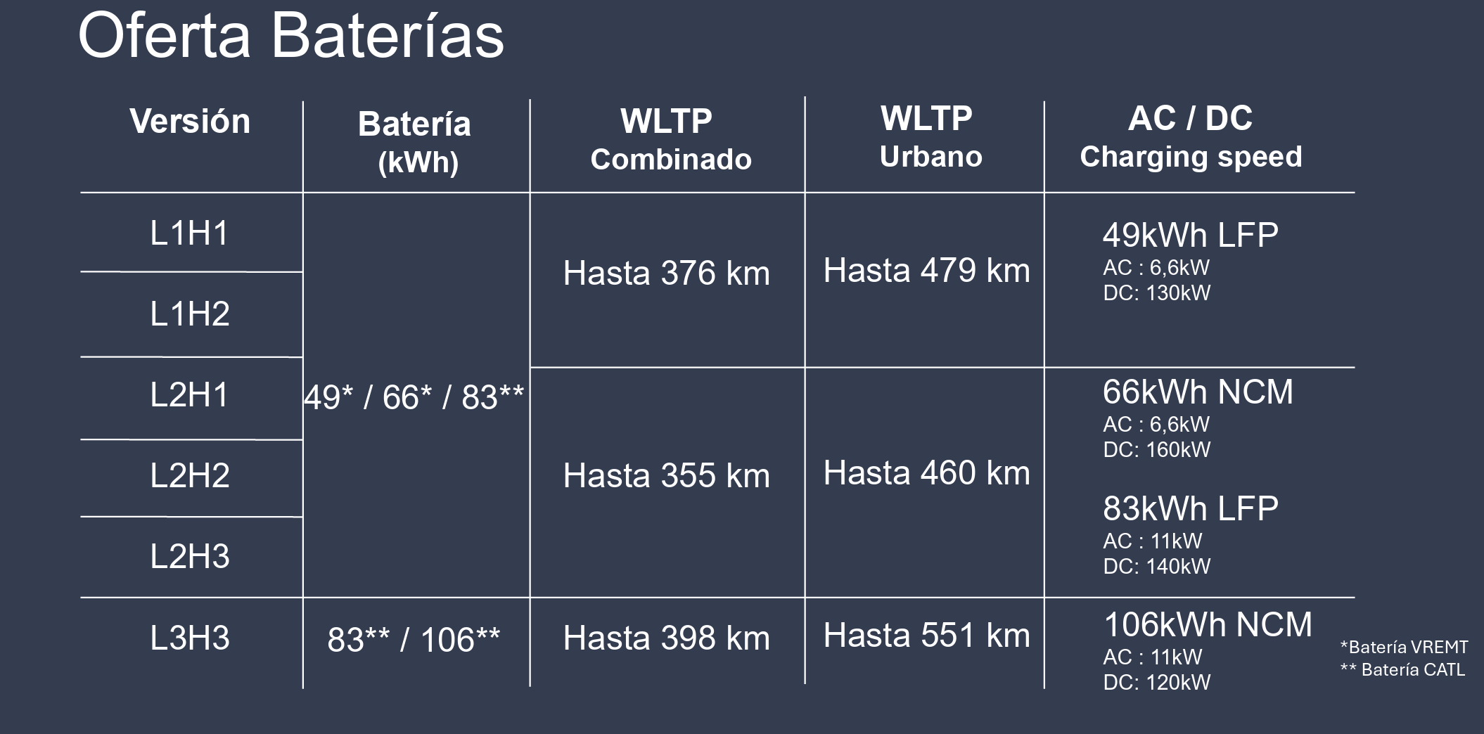 - Farizon ofrece 4 capacidades de baterías desde 49 a los 106 KWH, aunque esta última únicamente está disponible en las carrocerías de mayor longitud. La Supervan ha homologado un consumo WLTP urbano en su versión más ahorrativa de 17,6 Kwh/100 kms. Gracias a ello según la versión final elegida los rangos de autonomía eléctrica sin recargas intermedias en la ruta de distribución pueden llegar hasta los 551 kilómetros WLTP en ciclo urbano. Admiten, según batería elegida, carga lenta de hasta 11 Kw y rápida en corriente continua de hasta 160 Kw.