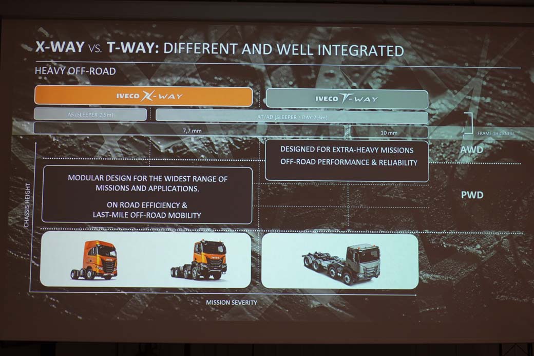 El T-Way de IVECO substituye a la anterior gama Trakker. De este modelo hereda sus robustos chasis y la misión de trabajar en el terreno más duro. Se trata de un auténtico camión para uso extravial, donde las versiones 8X4 y 8X8 fuera de carretera pueden soportar hasta 50 toneladas de peso total en carga. IVECO reserva para el nuevo T-Way únicamente sus motores más poderosos.