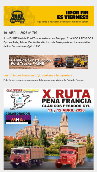 Por fin es viernes. Ya estamos una semana más con las noticias y novedades del sector del camión. Los F-LINE 8X4 de Ford Trucks estarán en SMOPYC, CLÁSICOS PESADOS CyL en Ruta, Primer Duotrailer eléctrico de Sesé y más en ¡La newsletter de los Encamionaut@s! nº 793