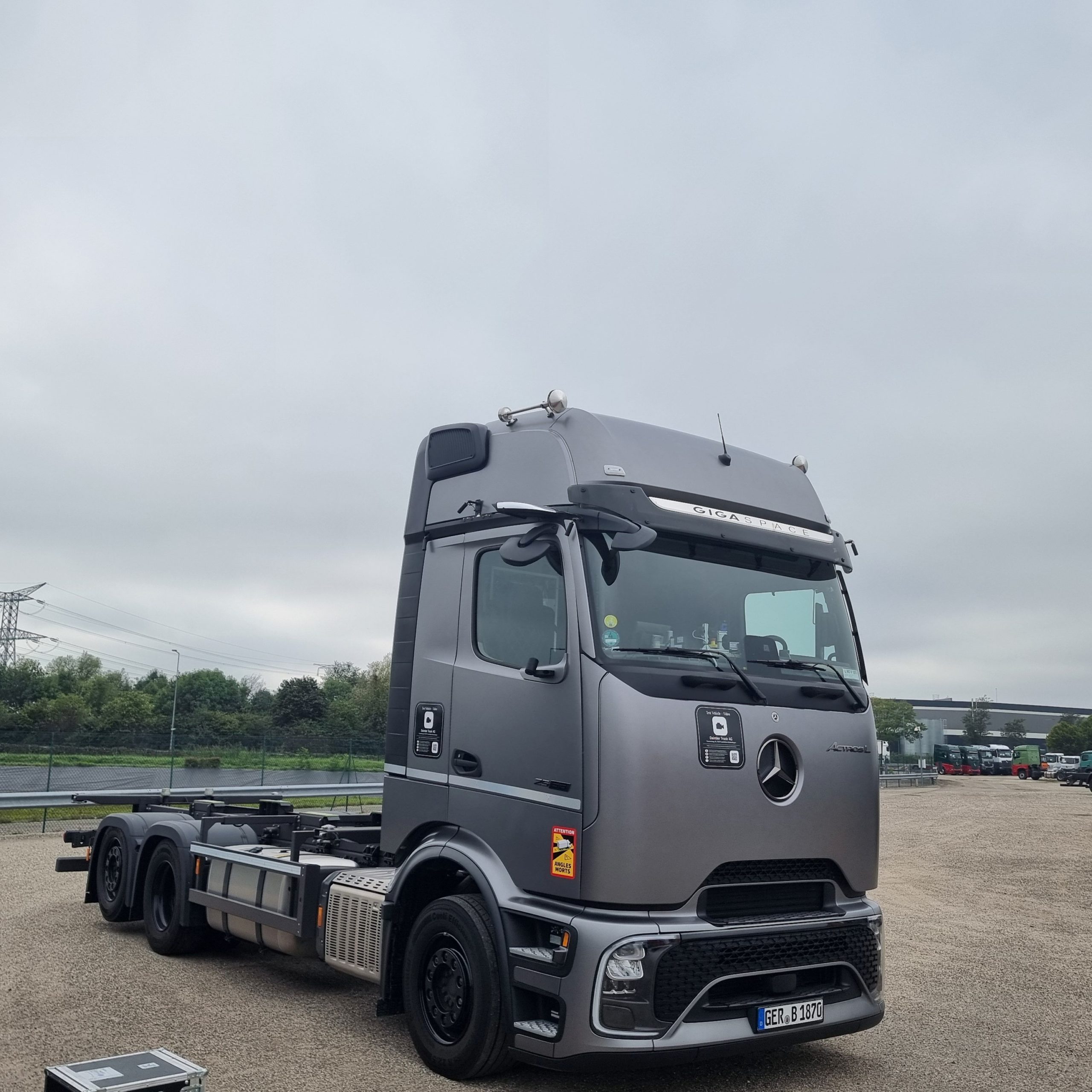 - Ya se ha empezado a crear variantes especiales también con la base del camión eléctrico a baterías Mercedes Benz eActros 600. Pudimos ver como ejemplos un chasis rígido de cuatro ejes 8X2 y una tractora 6X2 en ambos casos sobre la base del eActros 600.