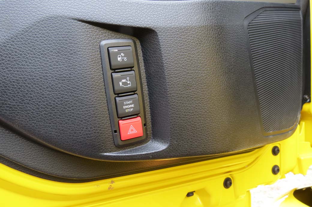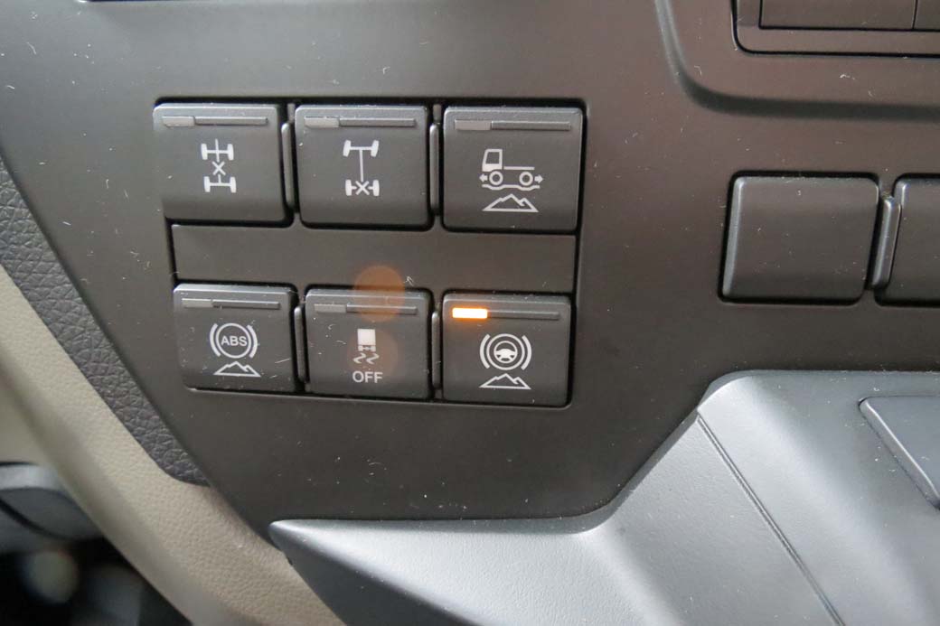 Este camión dúmper 8X4 MAN 35.470 dispone de la tecla que ayuda a salir de un bache balanceando adelante y atrás, del ya ,mencionado freno de asfaltado y el novedoso «freno de giro».