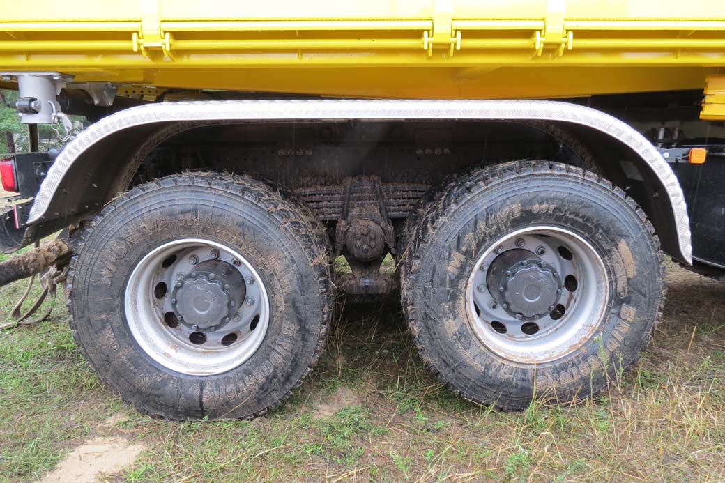 Chasis: Cuatro ejes, rígido con MMA de 32 toneladas a plena carga según legislación pero MMA Técnico para operar fuera de carretera de hasta 35 toneladas. Unidad probada equipaba volquete de descarga trilateral.