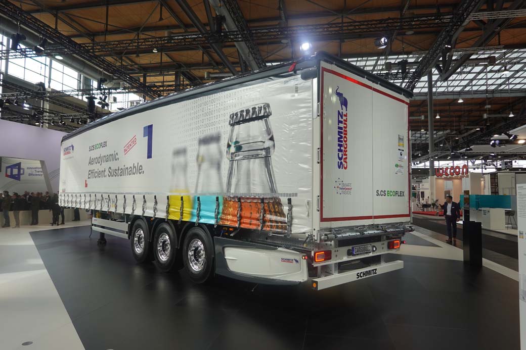 El semirremolque aerodinámico de lonas ECO Flex ha sido optimizado para mostrar la menor resistencia ante el viento. Eso se nota en primer lugar en la posibilidad de llevar la altura del techo regulada de modo su perfil disminuye la resistencia del aire. Además en esta plataforma Schmitz Cargobull presentó los nuevos cajones porta objetos aerodinámicos para la parte trasera de sus semirremolques. Otro elemento que contribuye a aumentar el ahorro de combustible y por tanto disminuye la emisión de CO2.