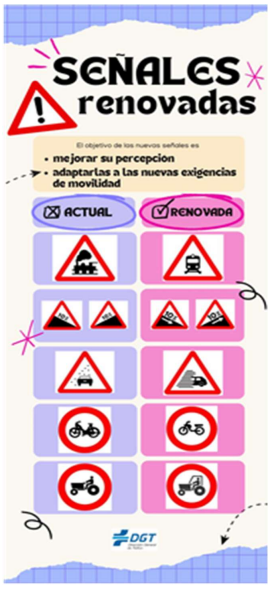 Esta actualización refleja los cambios en la sociedad y busca un sistema de señalización más claro, moderno y accesible para todos los usuarios de la vía. La reforma se ha realizado con la colaboración de varios ministerios. Se revisa el Reglamento General de Circulación, especialmente el Título IV sobre señalización vertical y marcas viales. Nuevas señales de la DGT .