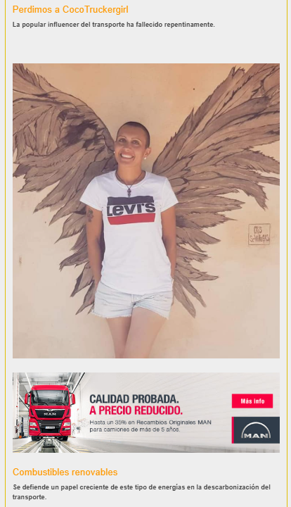 El mundo del transporte en España se levantó hace unos días con una triste noticia, el fallecimiento de Oti Cabadas. La camionera conocida en redes como Cocotruckergirl. Una de las figuras más queridas y relevantes del sector. Durante años, Oti rompió todos los estereotipos a golpe de volante y sonrisa. Haciéndose hueco en un mundo tradicionalmente masculino. Desde sus comienzos, desbordó pasión, autenticidad y alegría, inspirando a miles de conductores y conductoras con sus historias, consejos, anécdotas de ruta y mensajes de empoderamiento. Un abrazo y un saludo para su familia y amigos y para todos aquellos que alguna vez la conocimos. Ráfagas al cielo.