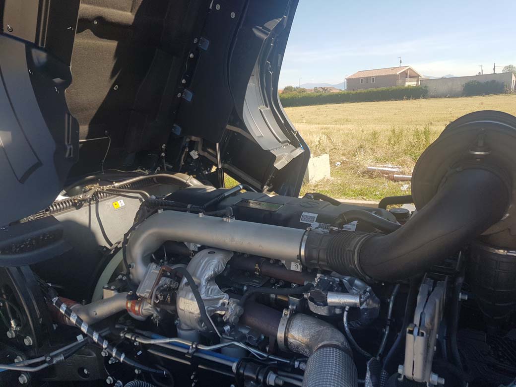 Motor: Ford Ecotorq Euro 6d. Seis cilindros en línea de 12,7 litros de cilindrada. Máxima potencia 500 CV a 1.800 rpm. Máxima potencia de par motor 2.500 Nm desde 1.000 rpm hasta 1.400 rpm. Potencia de frenado (intarder más freno motor) 1000 Kw.