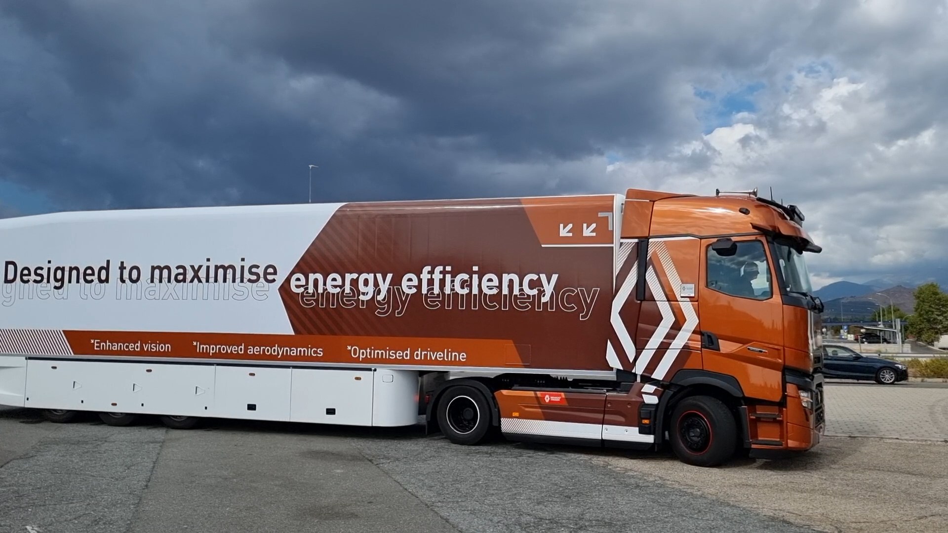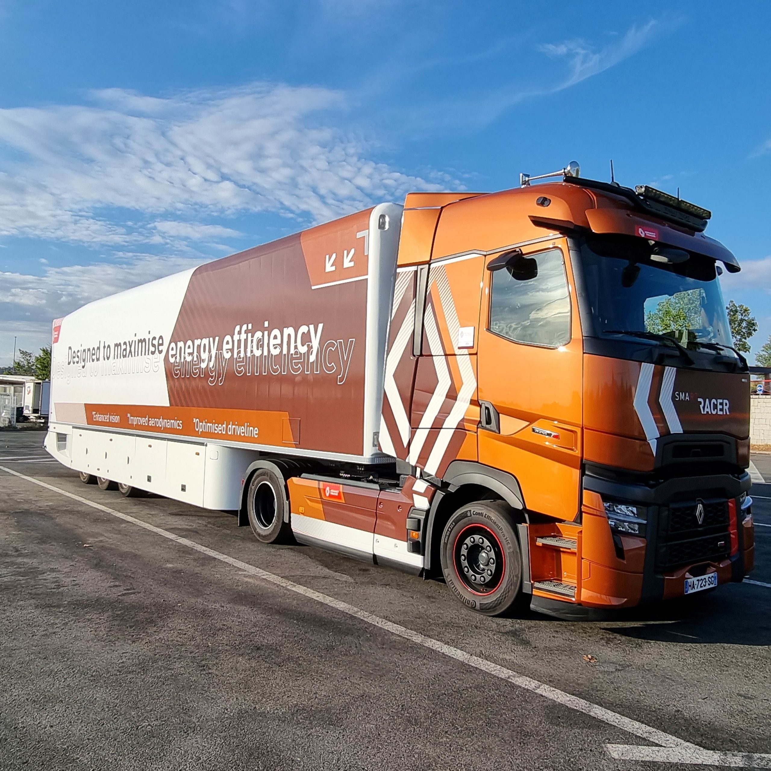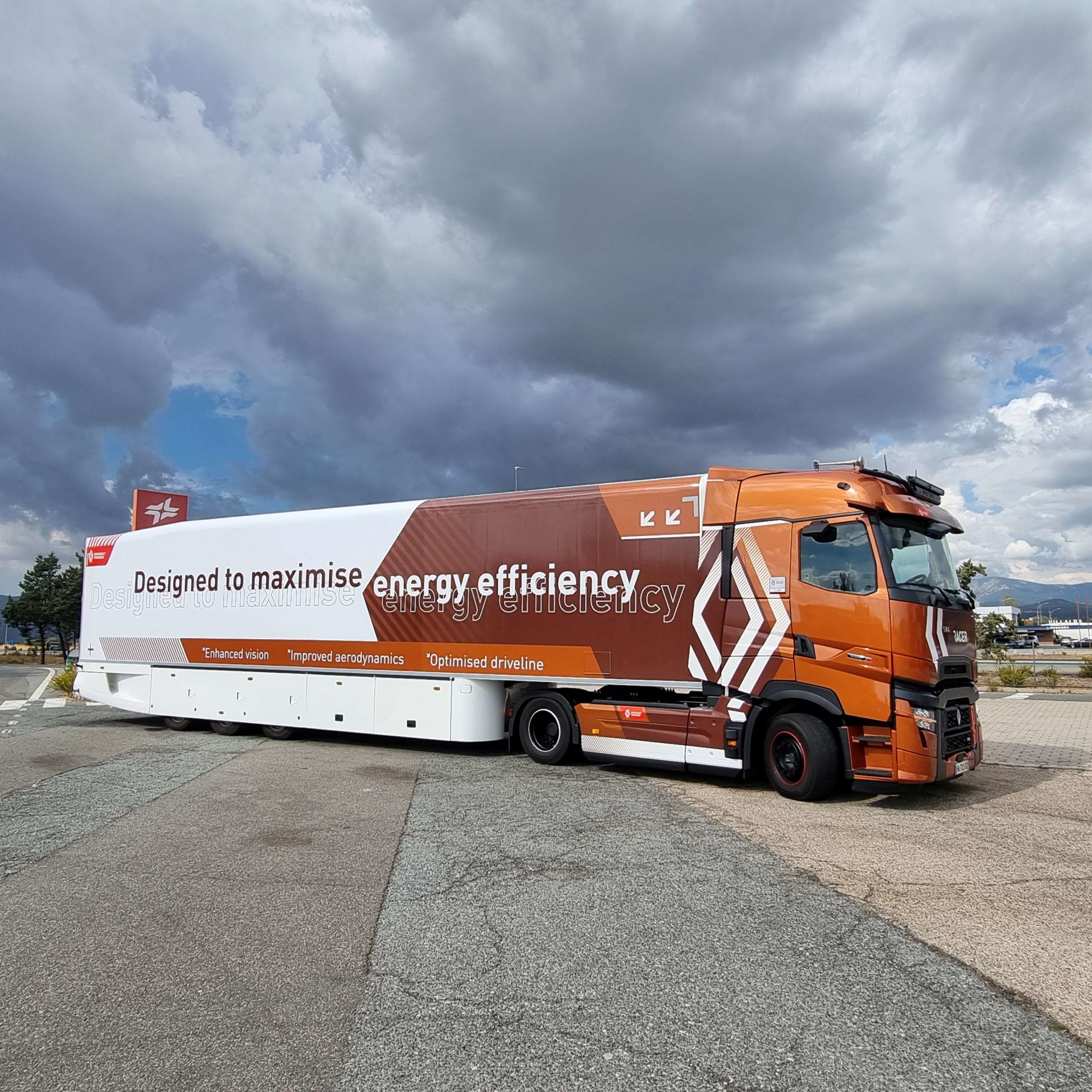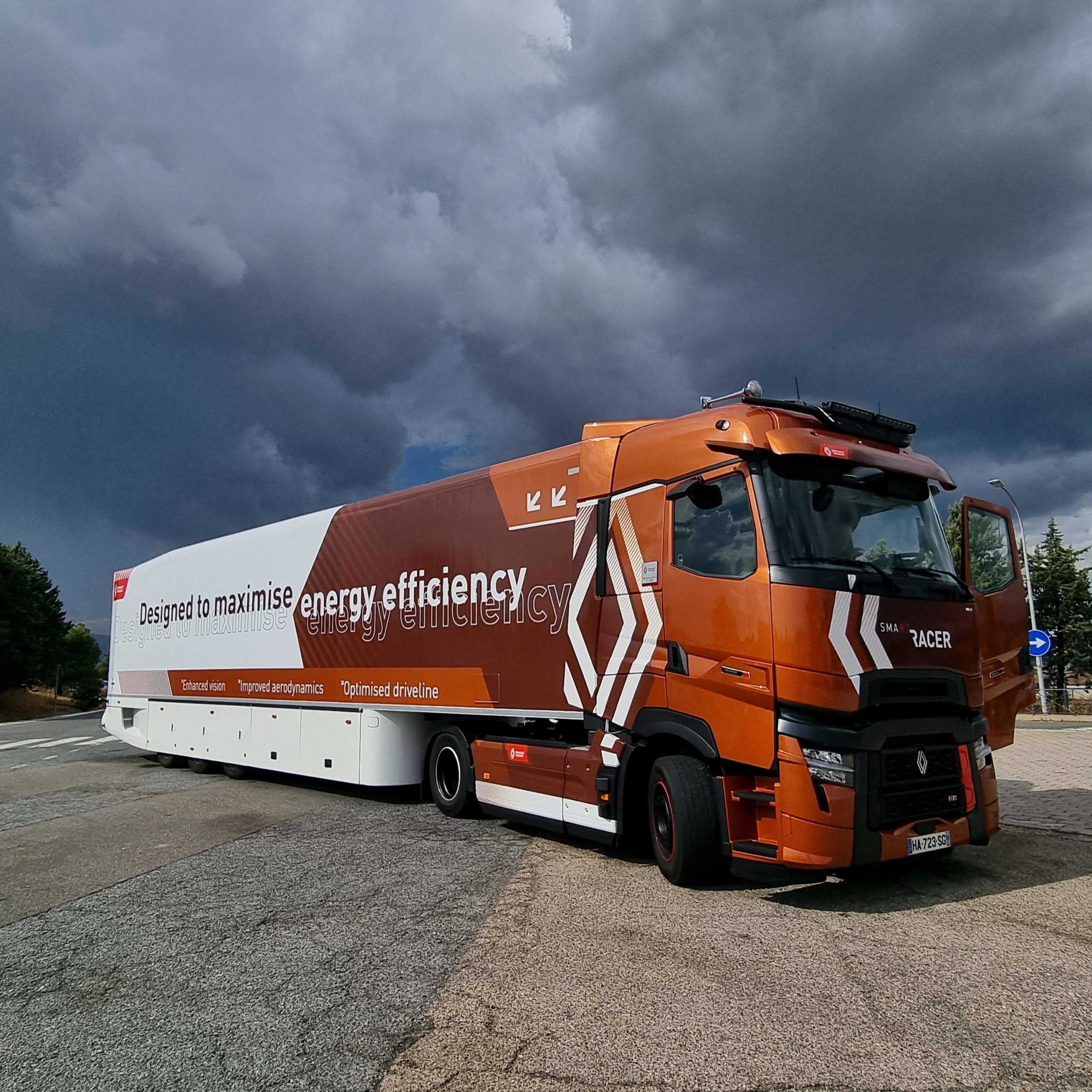 En esta ocasión Renault Trucks equipó al máximo su camión de pruebas, con faros adicionales, bocinas de aire y visera exterior. Se ha prirorizado la estampa elegante y espectacular del camión frente a la opción de consumos bajos.