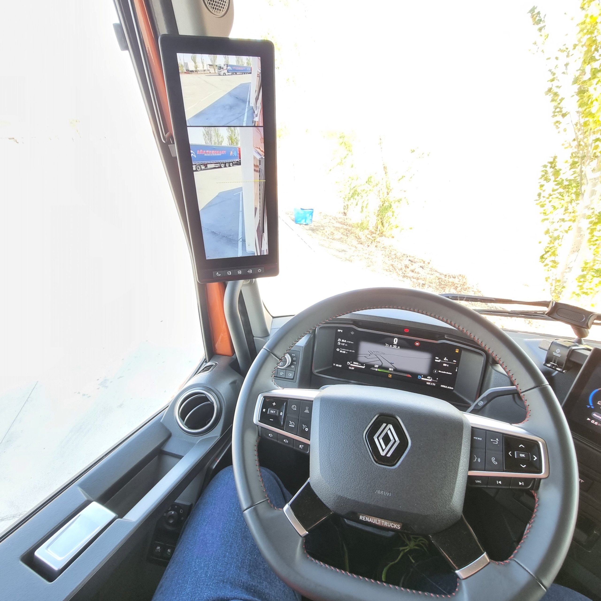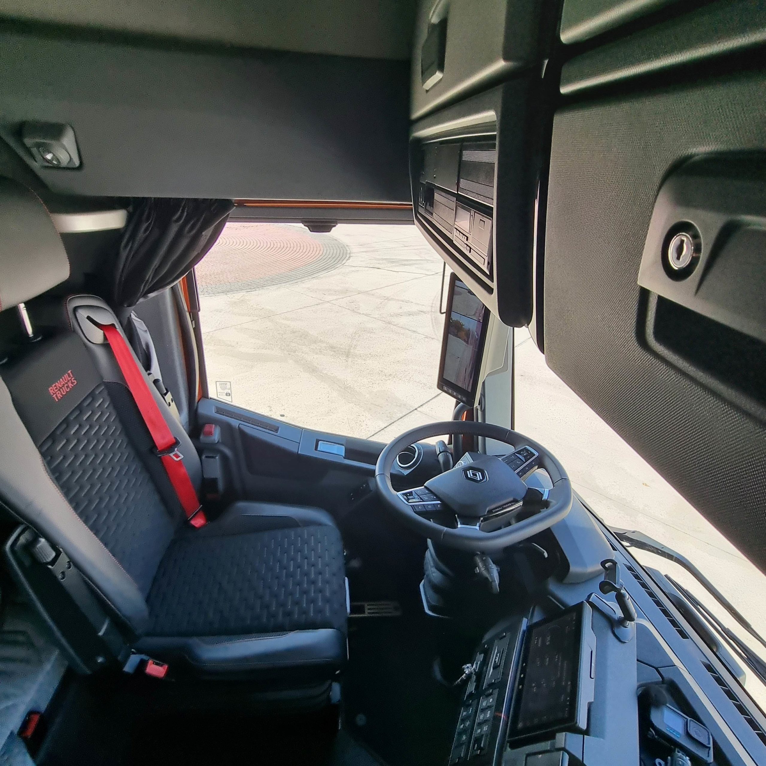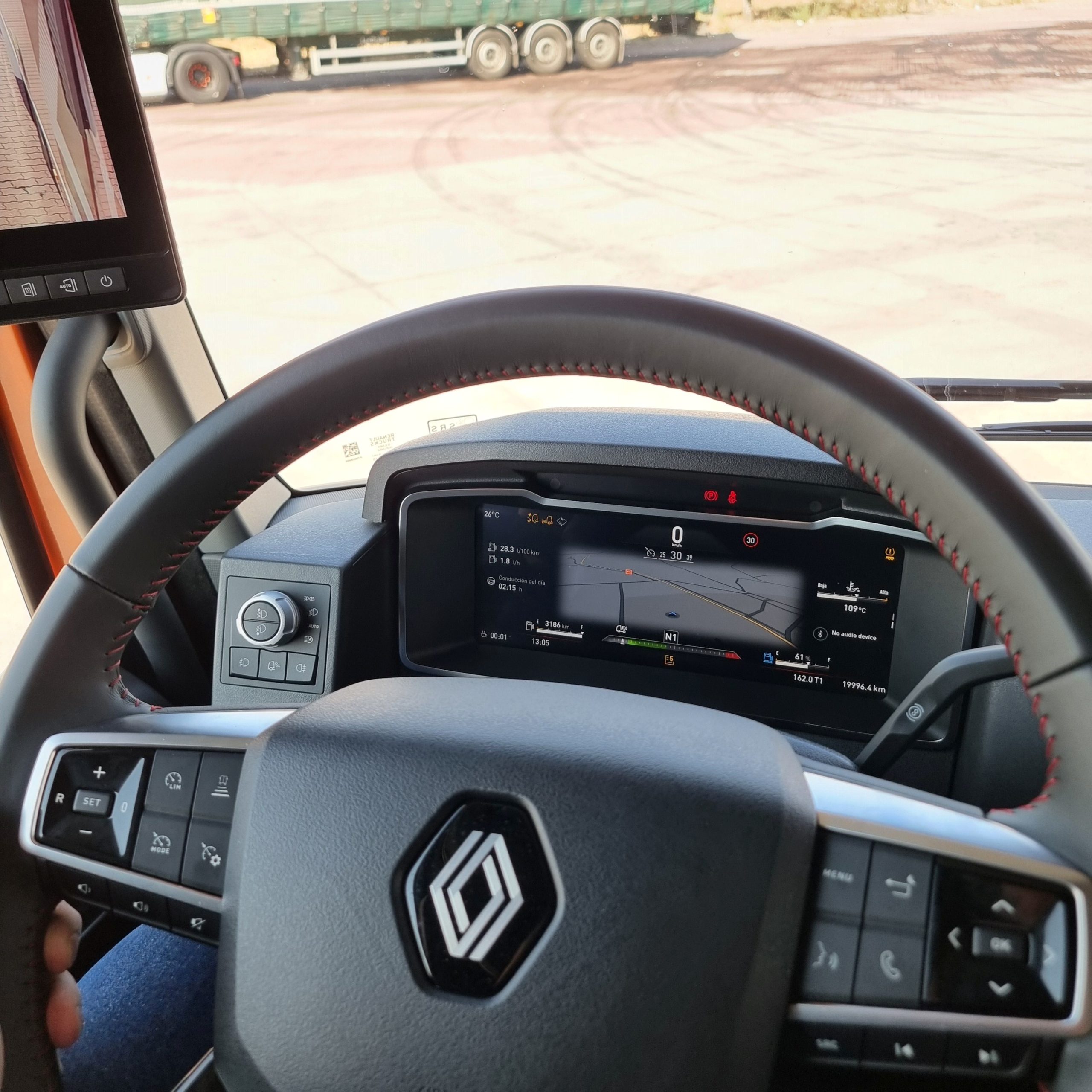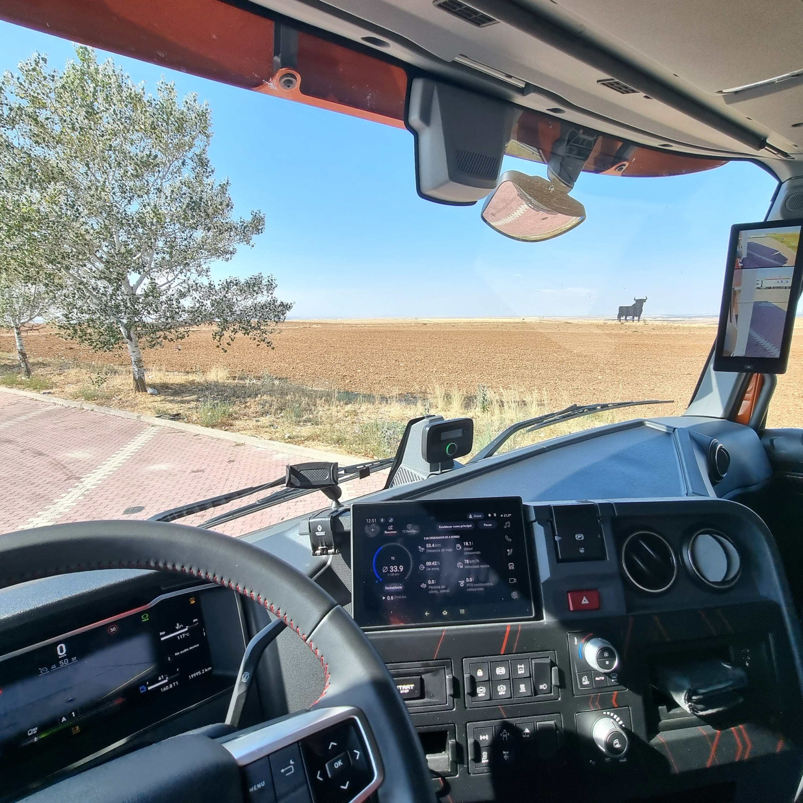 Sin embargo en un día que parte del recorrido nos acompañaron las tormentas, andar con un 40 T bajo los 25 litros de gasóleo a los 100 kilómetros nos parece un magnífico resultado. Además con un contenido consumo de adblue, en torno al 5 por ciento del gasto de gasóleo. Renault Trucks sigue mejorando una cabina, un poco justa en su parte frontal, pero con un gran equipamiento y que resulta muy cómoda para el trabajo. Ahora todavía más gracias a la llegada las mirror cams. Nos gusta mucho el plus de seguridad en cuanto a mejor visibilidad que ofrecen y encima mejoran la aerodinámica de una cabina que ya era muy buena en este campo.
