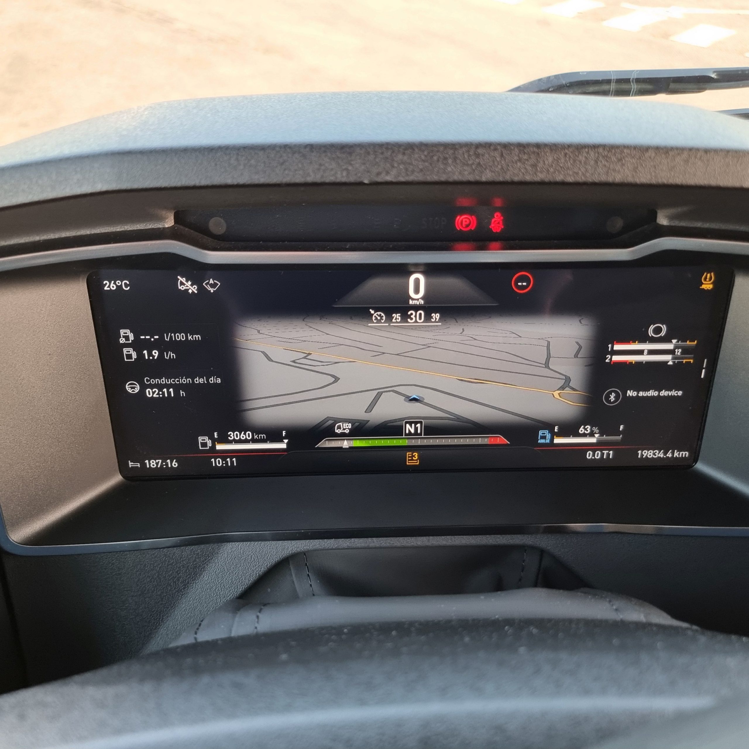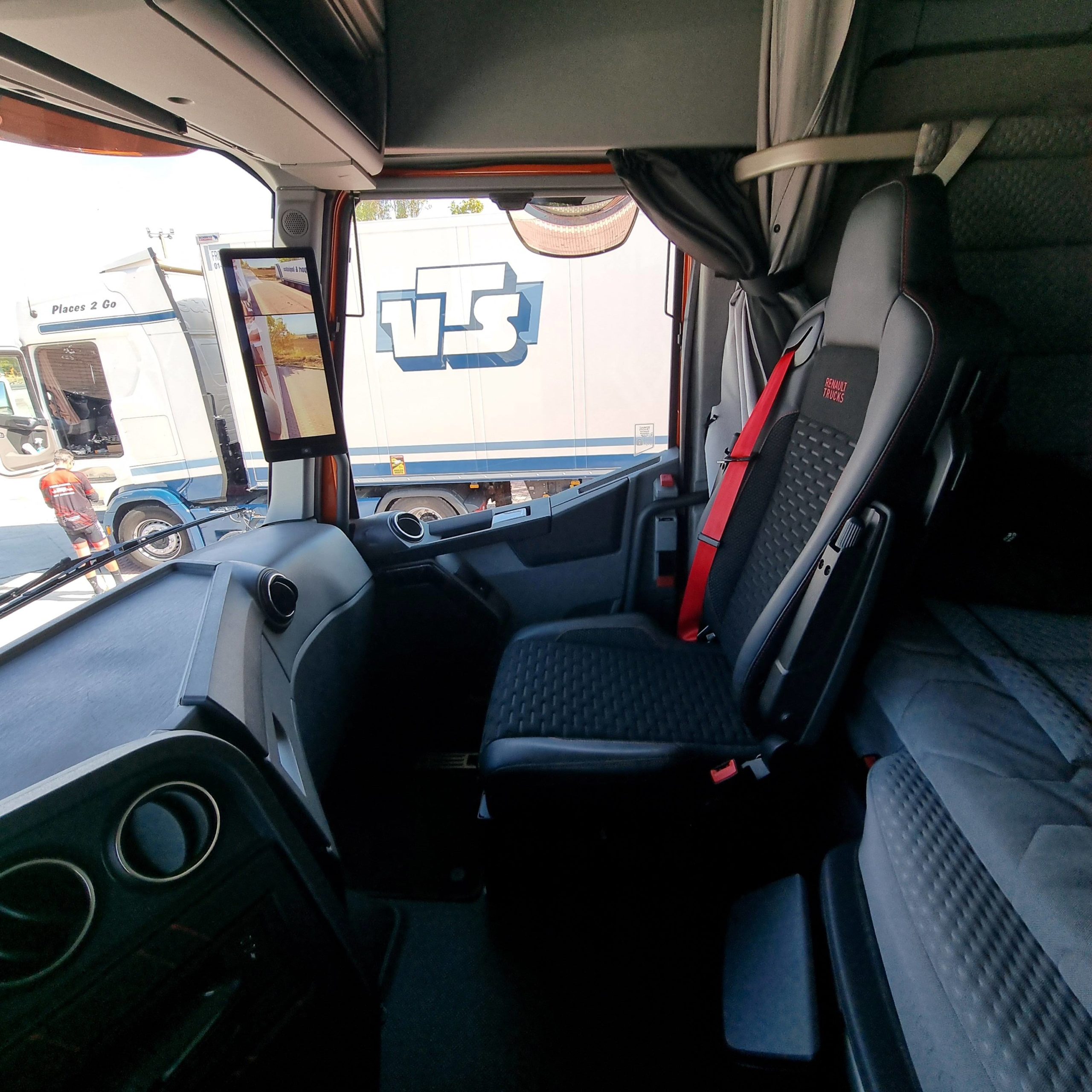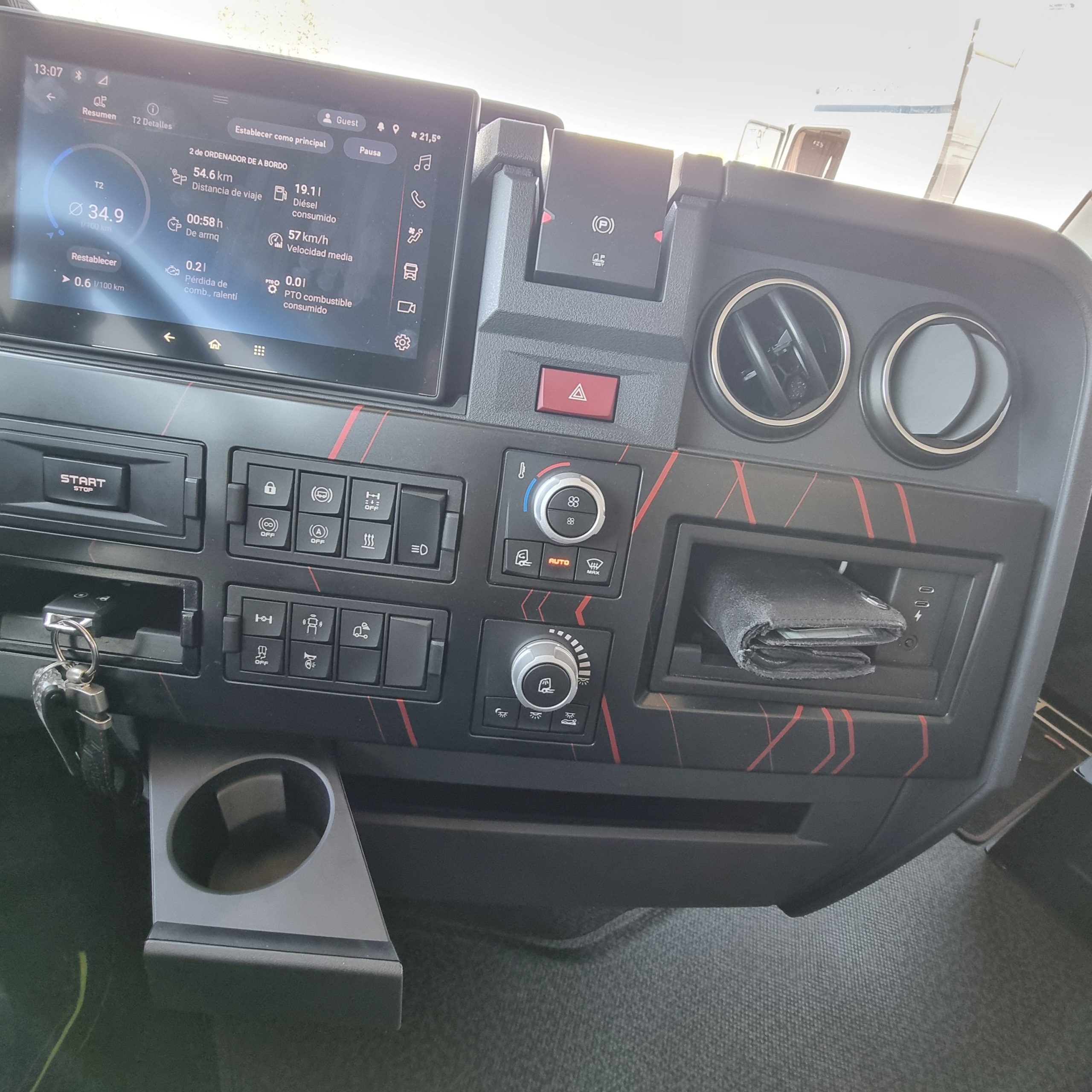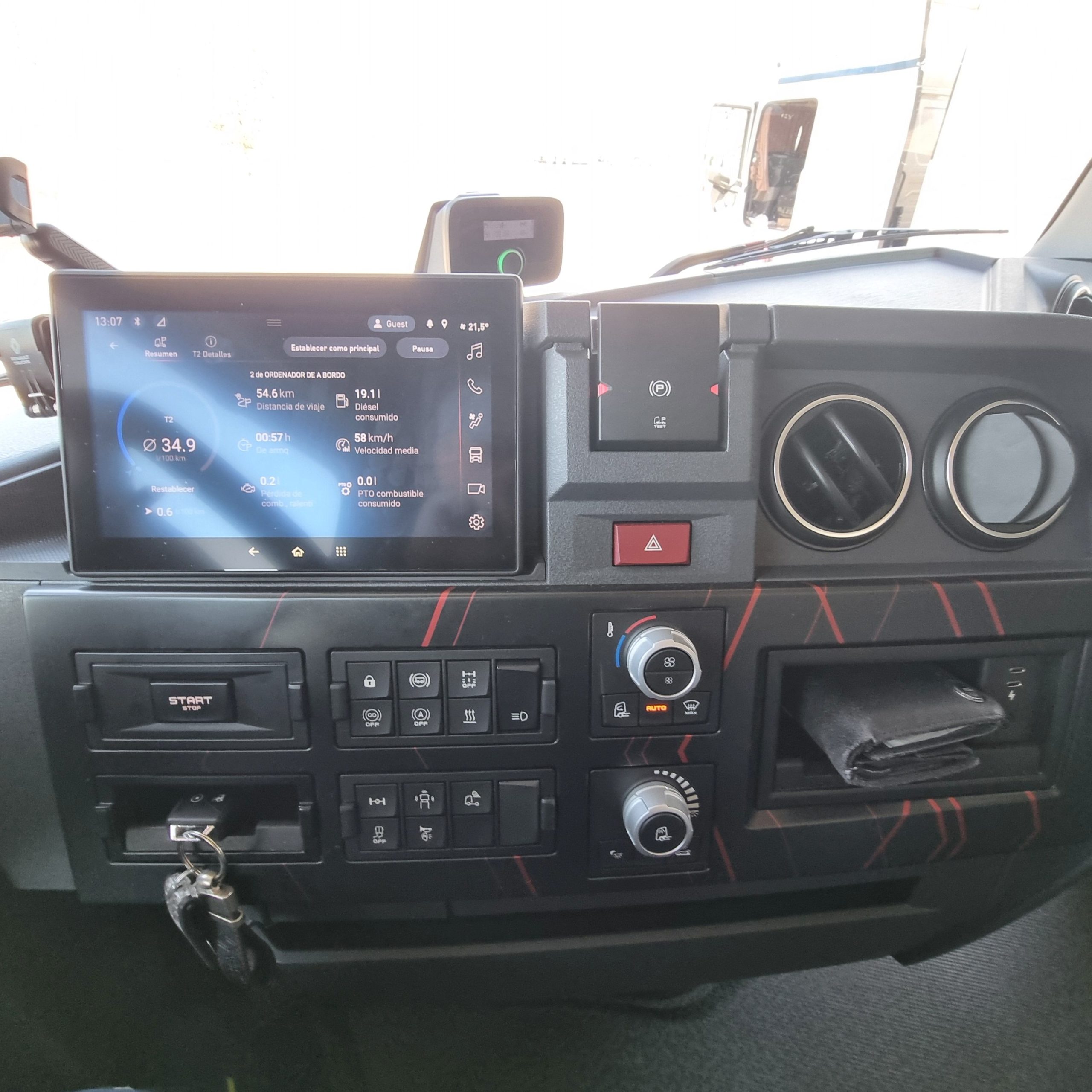 Sin embargo en un día que parte del recorrido nos acompañaron las tormentas, andar con un 40 T bajo los 25 litros de gasóleo a los 100 kilómetros nos parece un magnífico resultado. Además con un contenido consumo de adblue, en torno al 5 por ciento del gasto de gasóleo. Renault Trucks sigue mejorando una cabina, un poco justa en su parte frontal, pero con un gran equipamiento y que resulta muy cómoda para el trabajo. Ahora todavía más gracias a la llegada las mirror cams. Nos gusta mucho el plus de seguridad en cuanto a mejor visibilidad que ofrecen y encima mejoran la aerodinámica de una cabina que ya era muy buena en este campo.