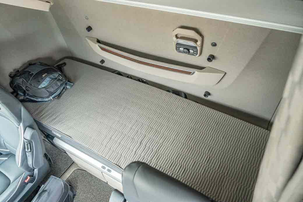 Hablando del descanso, la cama inferior nos ha causado una excelente impresión, con una forma rectangular y buen mullido. Los arcones bajo ella son de grandes dimensiones. En cambio los tres armarios frontales, el central ocupaba un horno, no son tan espaciosos como a priori esperábamos. Ello se debe a dos motivos. En primer lugar todo en el DAF XG+ prioriza el funcionamiento eficiente. Por ello incluso en este modelo con la cabina de mayor altura el techo tiene una inclinación en forma de cuña que es lo que resta algo de volumen a los armarios superiores.