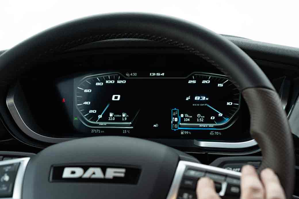 El volante sin embargo, pese a ser nuevo, con los mandos multifunción en sus radios, es muy del estilo DAF. Nos recuerda junto a elementos del diseño interior que estamos en un camión de la marca holandesa.
