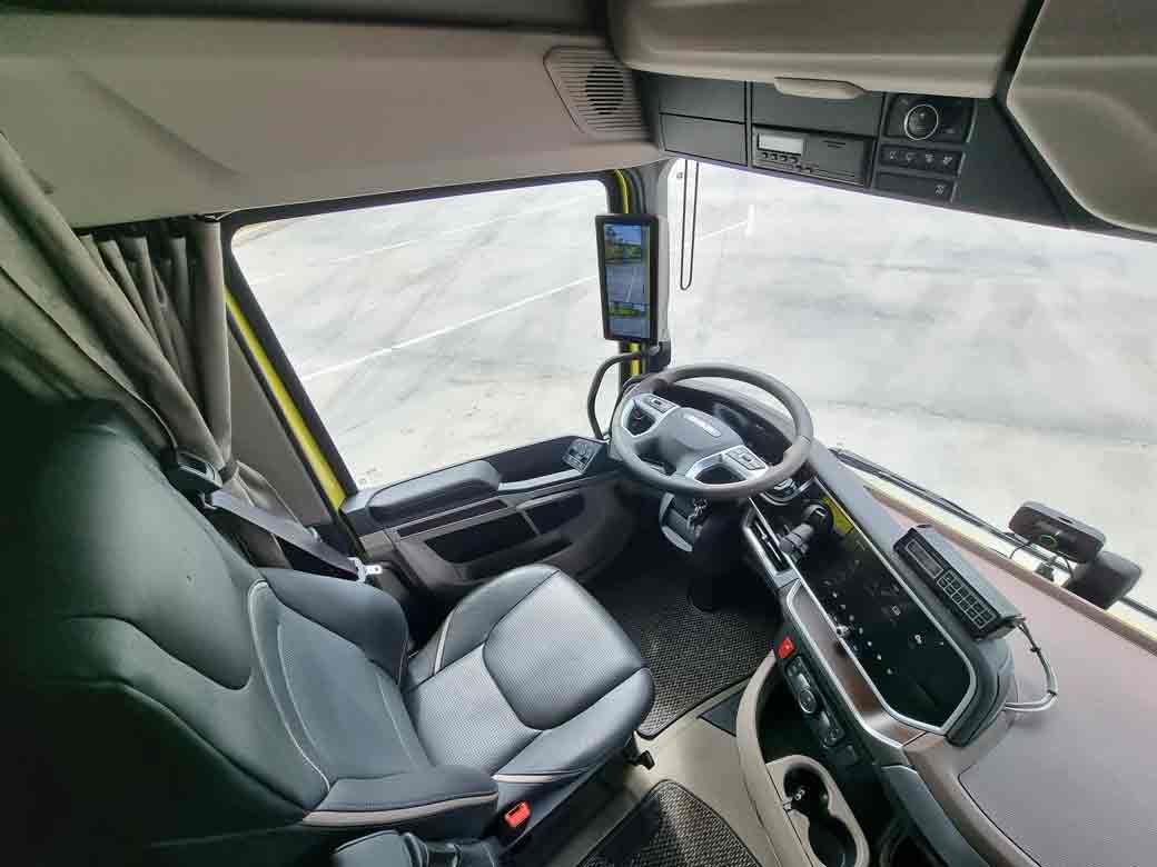 Esta tractora equipa el pack de equipamiento más lujoso. Destacamos lo bien que casan los asientos orientables hacia el centro, como en una autocaravana, con la mayor longitud disponible. En los momentos de descanso en que debamos permanecer dentro de la cabina el conductor de un DAF XG+ se convertirá en un auténtico privilegiado. Eso sí a cambio la distancia entre ejes es de 4  metros y el hueco que nos queda entra la cabina y un semi de máxima longitud puede resultar escaso. Pero ese es el precio por disfrutar de una de las mejores cabinas para largo recorrido del momento.