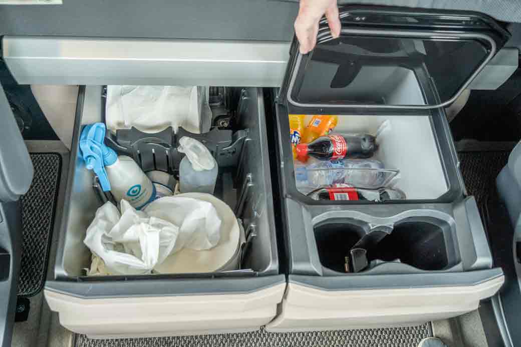 Mesa central extraíble. cama superior de 0,7 m de ancho y 2 m de largo. Tres armarios en zona delantera superior. Dos cofres accesibles desde exterior bajo la cama principal y nevera central con posición botellas de agua a mano.
