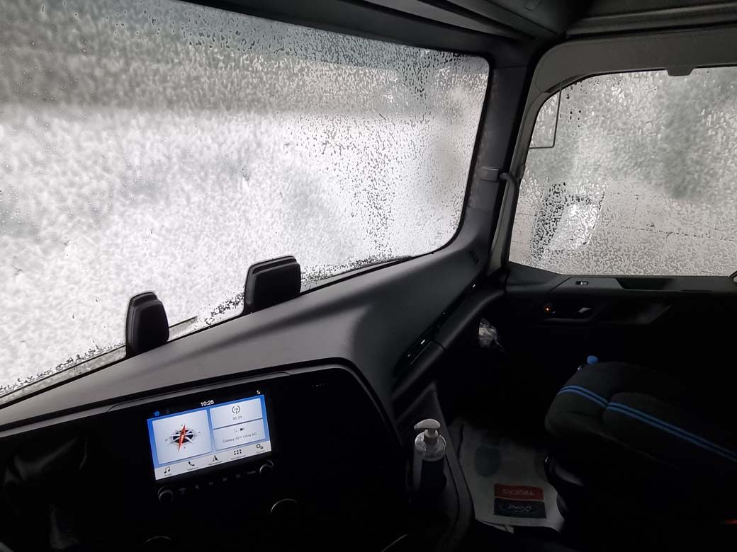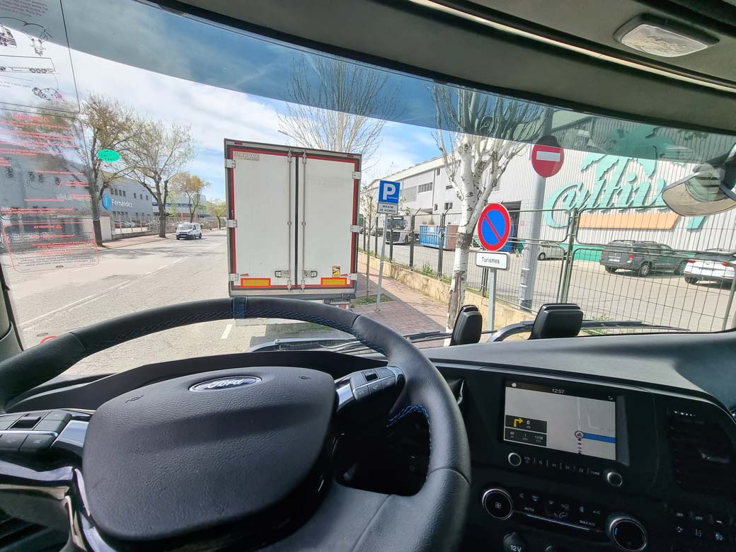 Simplemente recorriendo la A2 desde Madrid en dirección a Zaragoza empezamos a recuperar la opinión que nos había dejado la primera unidad F-Max que probamos. Esta tractora destaca en primer lugar por las generosas dimensiones de su cabina. Estamos a bordo de uno de los habitáculos con más espacio útil. Esto se nota tanto en los seis armarios superiores, tres en el panel trasero que no impiden disfrutar de una segunda cama, como en una altura libre dentro de la cabina superior a los dos metros. La cama principal es de generosas dimensiones. Otro aspecto donde el Ford Trucks F-Max destaca es en el buen aislamiento acústico. Lo comprobamos cruzando una furibunda tormenta. Max, como llamamos a la tractora 007 de la edición limitada Blackline, pasó la prueba con nota alta.