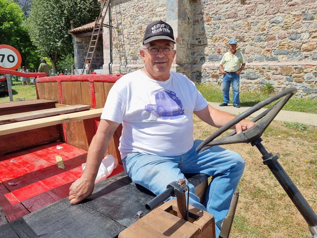San Cristóbal y electromovilidad. Junto a la ermita vemos a la jovencísima Luanna al volante de un camión Actros eléctrico de juguete, acompañada por la fantástica creación de Carlos Fernández, un carro transformado con la ayuda de los especialistas en máquinas de control numérico de TECOI. Este carro del siglo pasado cambió los bueyes por un motor eléctrico que acciona el eje trasero.