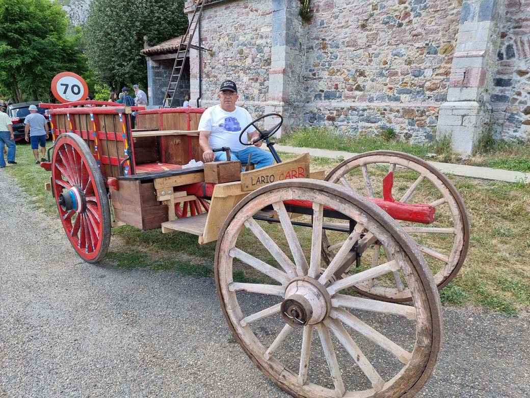 San Cristóbal y electromovilidad. Junto a la ermita vemos a la jovencísima Luanna al volante de un camión Actros eléctrico dde juguete, acompañada por la fantástíca creación de Carlos Fernández, un carro transformado con la ayuda de los especialistas en máquinas de control numérico de TECOI. Este carro del siglo pasado cambió los bueyes por un motor eléctrico que acciona el eje trasero.