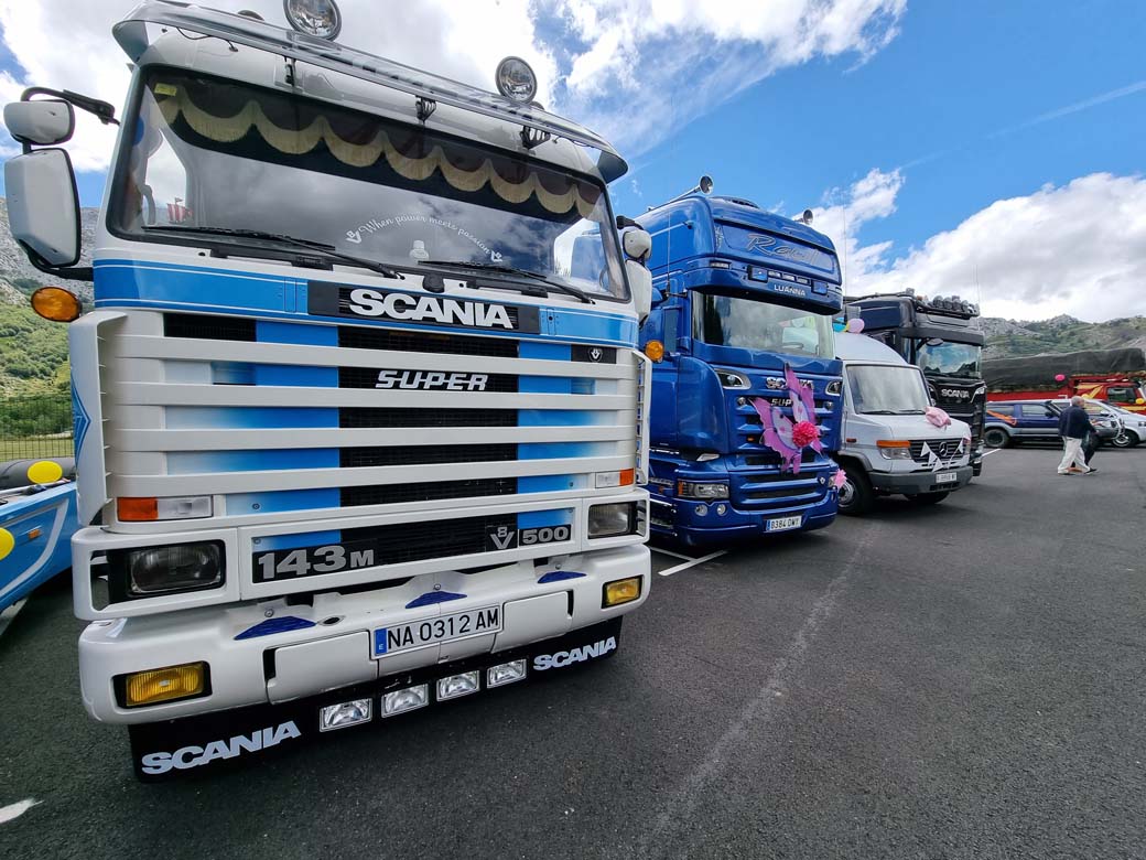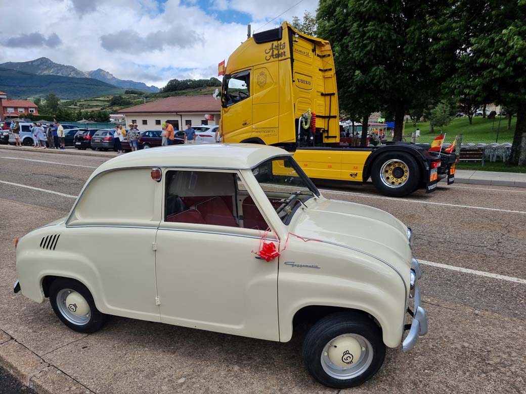 Pudimos admirar desde un diminuto Gogomóvil, microcoche clásico en versión comercial, de los años 50 del pasado siglo, hasta un espectacular Volvo FH 16 de primera generación y sus contundentes 750 CV. Esto es por citar sólo el menos y el más potente de los vehículos allí concentrados. La tractora FH16 con más de 800.000 kms recorridos luce impecable. Ello nos habla del buen hacer de Mateo, su propietario. Un encamionaut@, a quien aprovechamos la ocasión para saludar, habitual del Puerto de Pajares que con sus rampas extremas separa León de Asturias.
