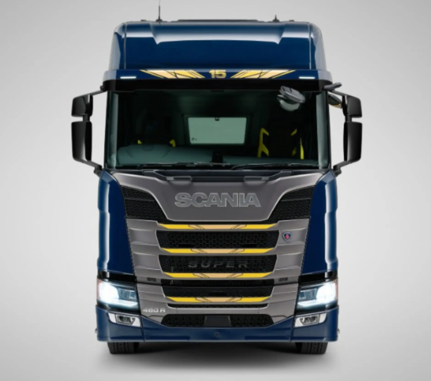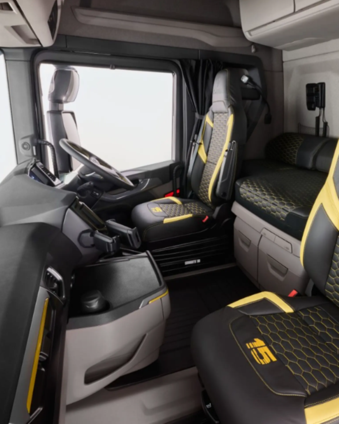 El interior destaca un camión funcional, pero con el toque exclusivo de Svempas. Con la tapicería de los asientos y la cama con pespuntes en amarillo dorado. Y, por supuesto, no podía faltar el logotipo «15» repartido por diferentes partes del camión, recordando que esto es algo único. Con toques de este mismo color en el salpicadero. Detalles que hacen que estas exclusivas unidades no pierdan su funcionalidad.
