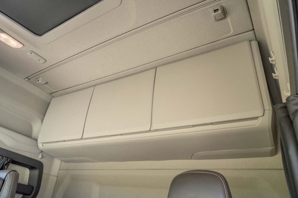 Cabina:Serie s versión de techo alto Highline con una cama y dos filas superiores de armarios.Altura libre 2,07 m, altura libre máxima 2,07 m. Longitud cama inferior 2.m y ancho máximo 1 m. Sin Túnel motor, cuatro escalones de acceso. Asiento del acompañante banqueta plegable.