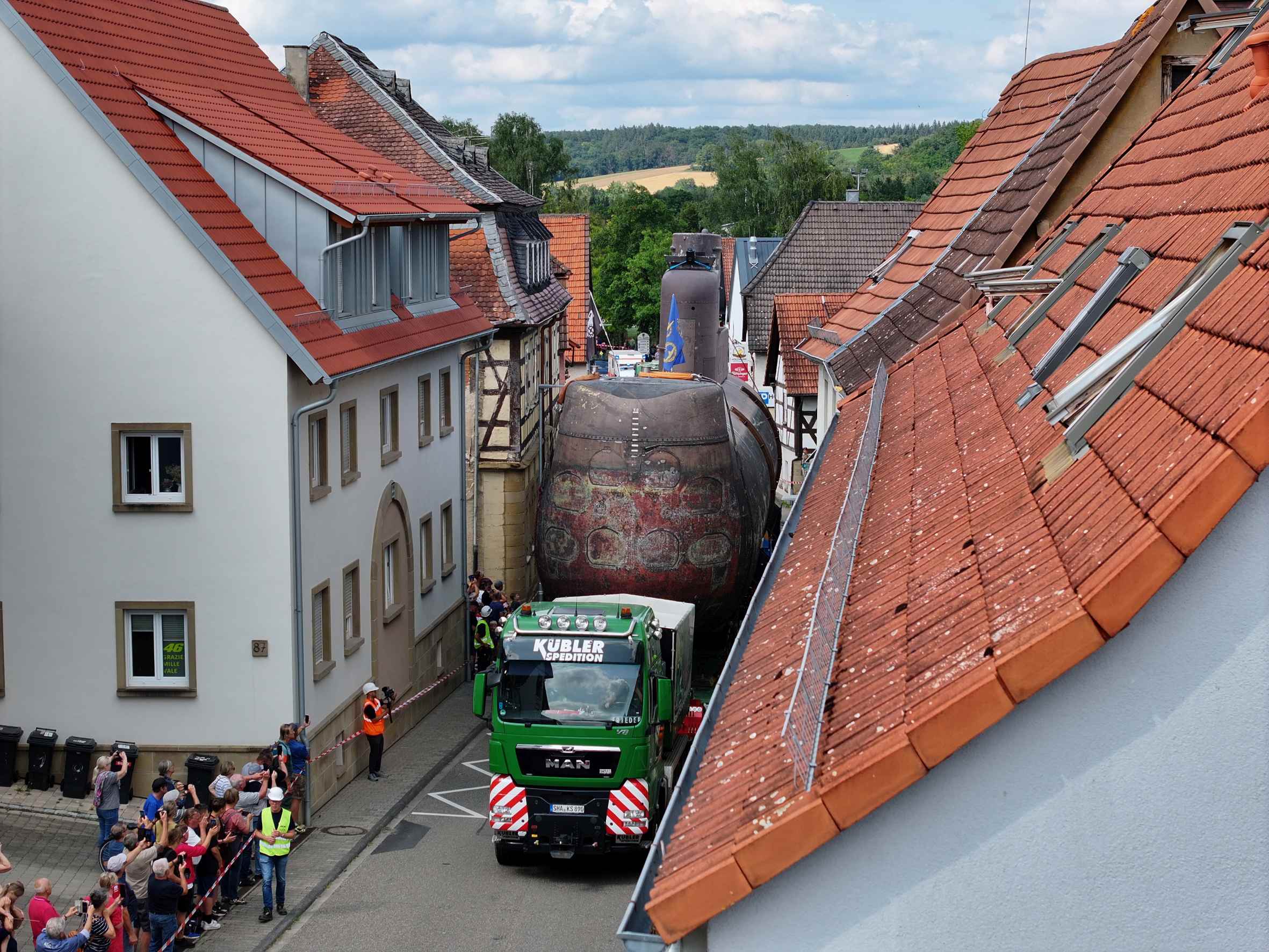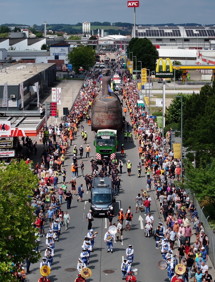 Después de 2 años de preparación, grandes esfuerzos y elevada participación. Se ha podido lograr este traslado gracias a un dispositivo de giro especial que permitía inclinar el submarino 73° y volverlo a poner vertical en lugares estrechos. Para superar obstáculos, principalmente cruzar pasos a nivel y pasar por debajo de varios puentes, con unos pocos centímetros de margen. En total en todo el recorrido se giró en submarino 14 veces.