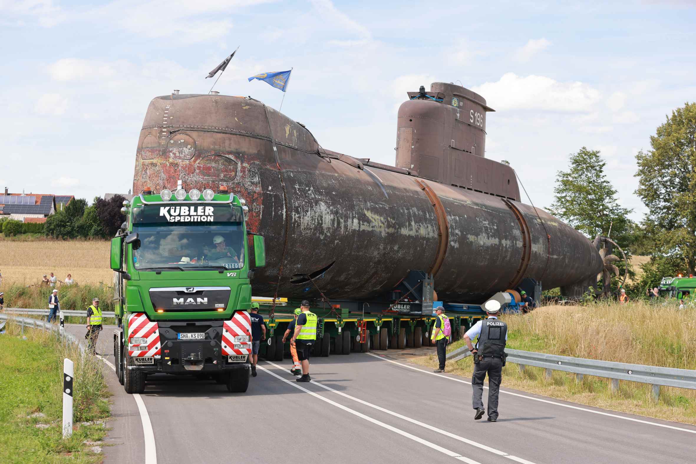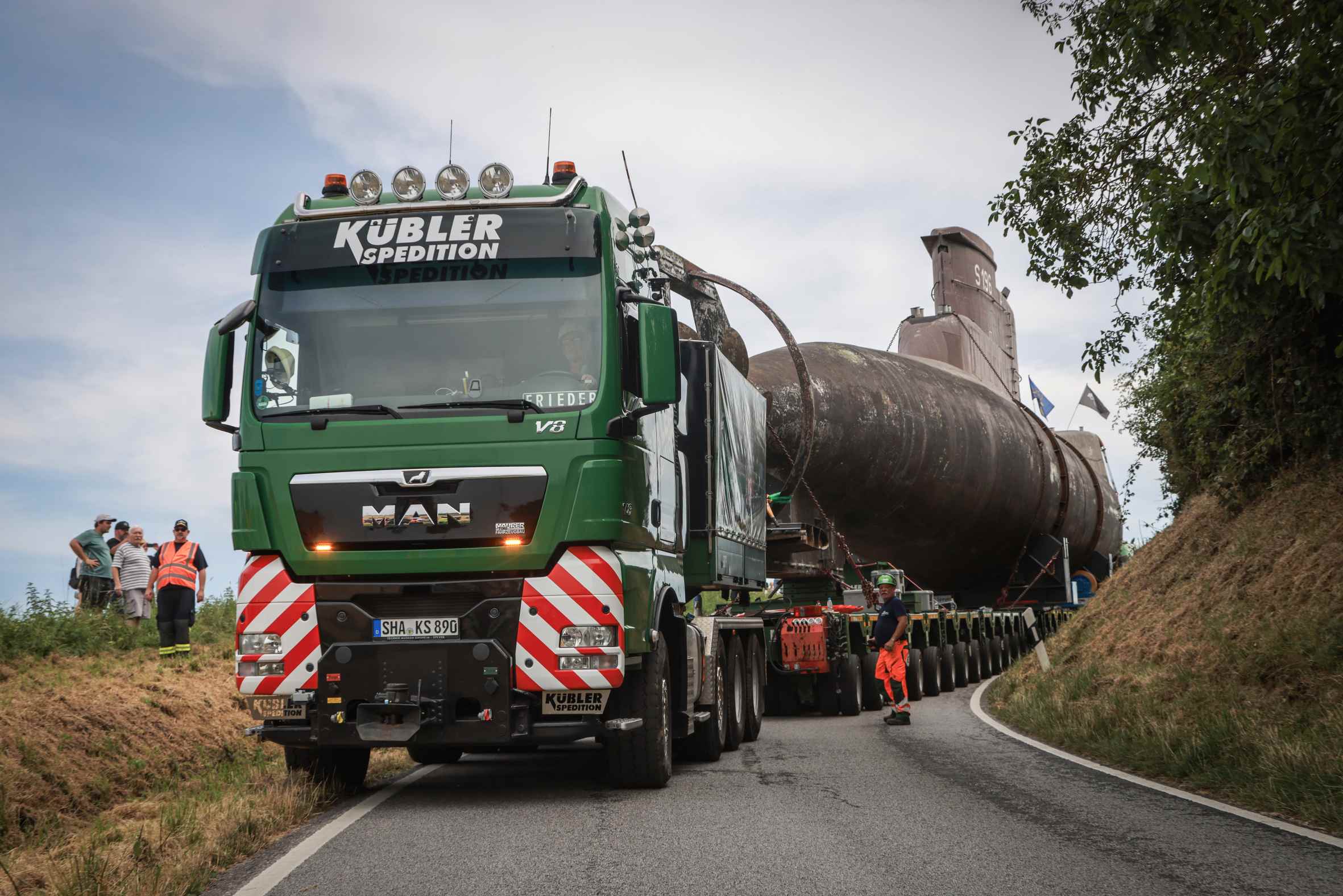 Los especialistas alemanes en transportes especiales, Kübler Schwertransporte, han sido los responsables de este espectacular traslado. Su carga: un submarino U 17, retirado del servicio en el 2010, con casi 50 metros de largo, 6 metros de ancho, hasta 12 metros de altura y 350 Tm de peso. Que se suman a las 150 toneladas que pesa la góndola de suelo bajo y 30 ejes. Todo ello, arrastrado por una colosal tractora MAN TGX 41.680 8×6.