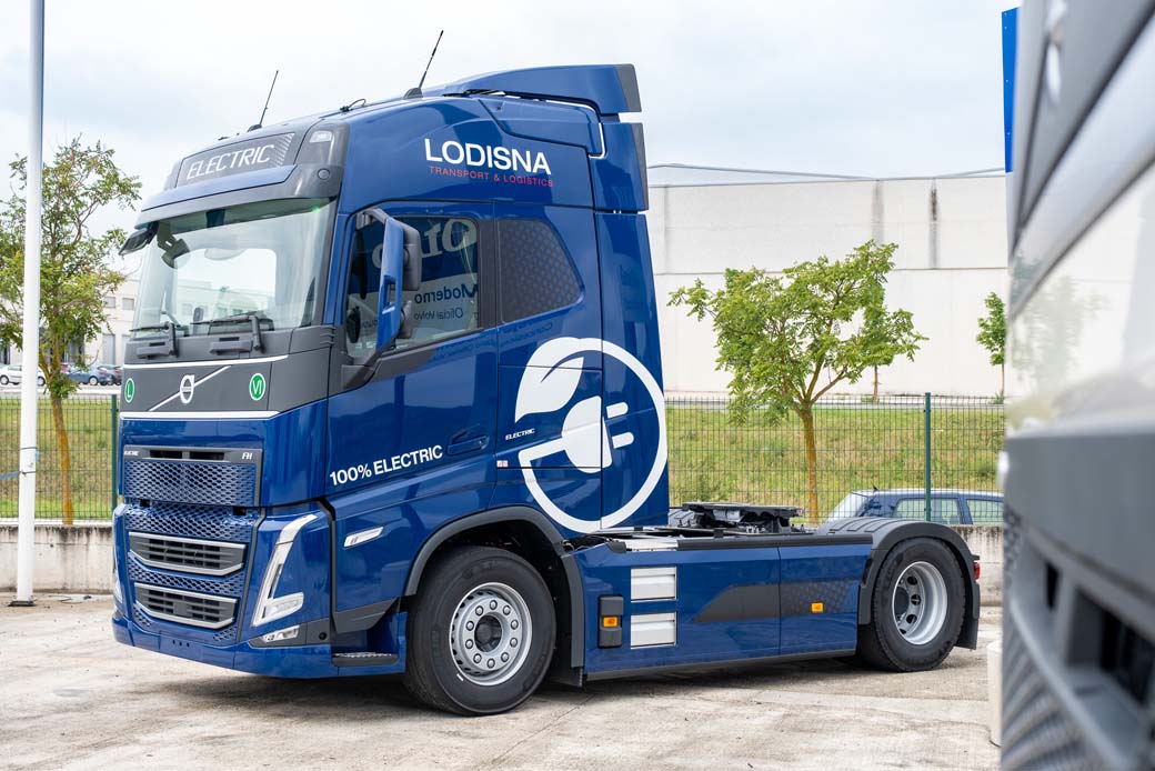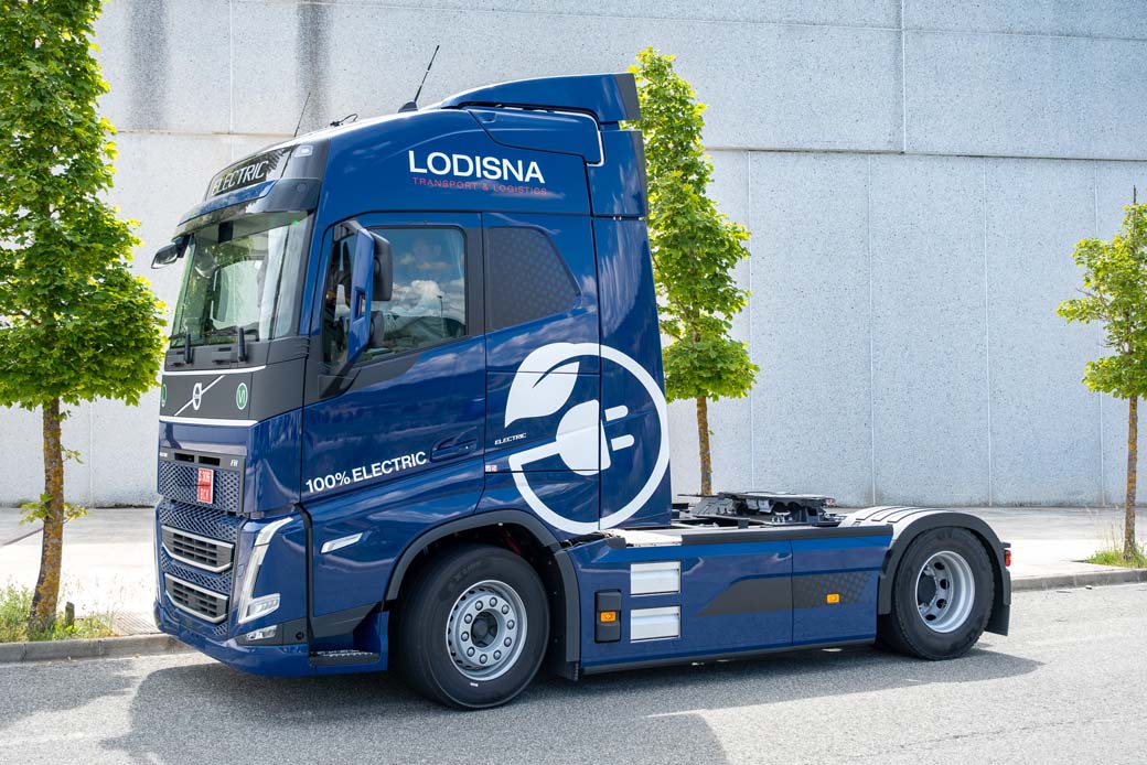 El modelo Volvo FH Electric, pionero en la industria de transporte de larga distancia, alcanza una autonomía de hasta 300 kilómetros, destacando su línea motriz potente y suave. Cuenta con 3 motores eléctricos que se combinan con la caja de cambios I-Shift de Volvo, y que ofrecen tres potencias distintas: continua al eje de 315kw (430CV), pico al eje de 490 kW (666HP) y par motor instantáneo de hasta 2.400 Nm. Además, están dotados de baterías de última generación, con un almacenamiento de energía total de 540kWh. Este camión ha sido incorporado a la flota de Lodisna como una solución completa de Volvo, llevando asociado un contrato de mantenimiento y reparación, gestión de flota, a través de una solución completa de Volvo Financial Services especial para la transformación a electromovilidad.