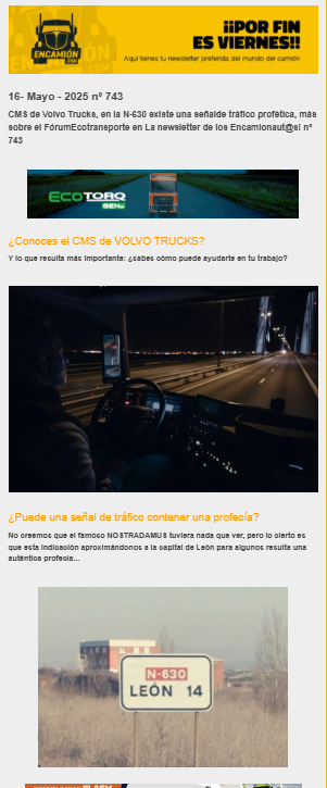 Actualidad del TRANSPORTE. Esta semana todo sobre las CMS de Volvo Trucks, en la N-630 existe una señal de tráfico profética, más sobre el FórumEcotransporte…….Ya está aquí la newsletter de encamion nº743